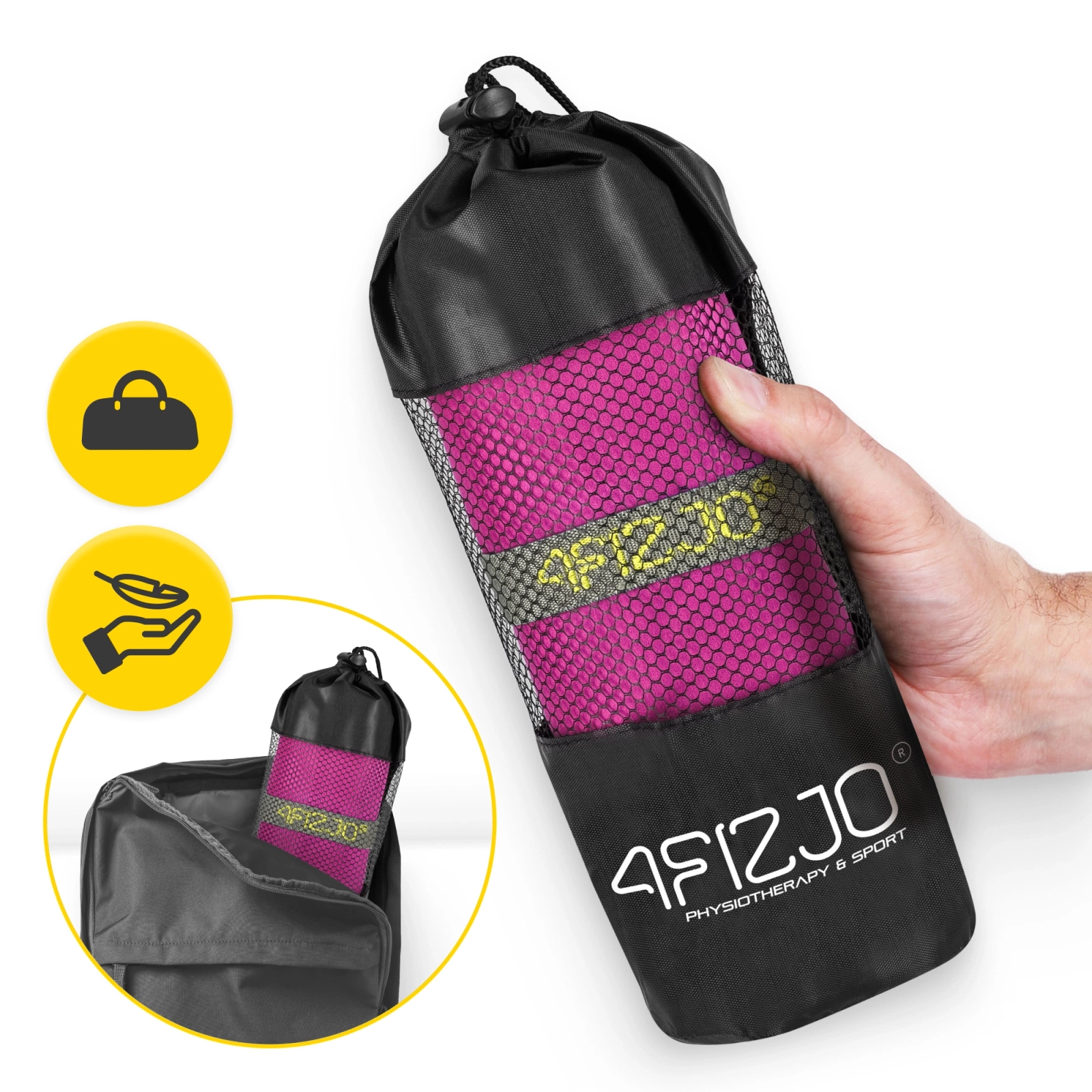 Rychleschnoucí ručník 4FIZJO je vyroben z vysoce kvalitního mikrovlákna, které je mimořádně jemné, savé a odolné. Dodatečné prošívání na okrajích zabraňuje navíc třepení materiálu, aniž by to ovlivnilo komfort používání. Ručník zabírá málo místa a jeho skladování a přenášení usnadňuje praktický obal s gumou. To, co je obzvláště důležité, jsou jeho rychleschnoucí vlastnosti – schne během několika minut! Díky tomu je ideálním společníkem na cestách, v posilovně nebo při jakékoli venkovní aktivitě.