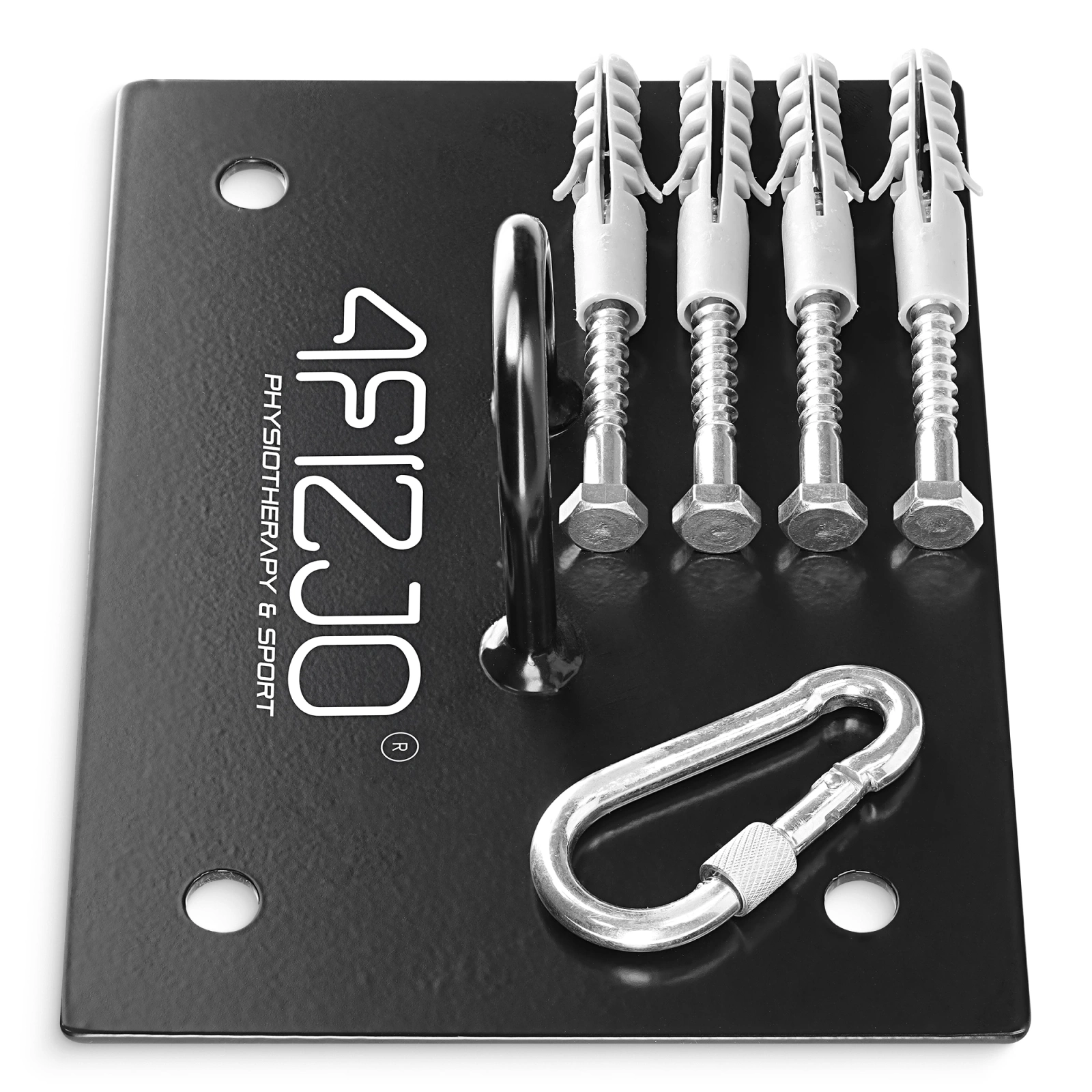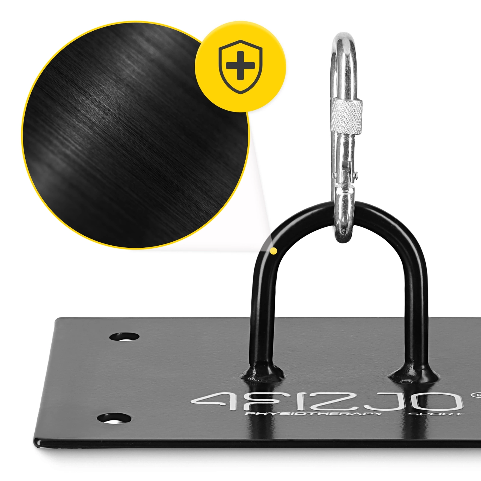 Držák byl vyroben z pevné oceli. Tloušťka plechu 3 mm zajišťuje stabilní uchycení tréninkového pytle. Díky čtyřem odolným vrutům je montáž rychlá a jednoduchá, přičemž maximální nosnost činí až 150 kg. Co to znamená v praxi? Bez obav na něj můžete zavěsit i ten nejtěžší pytel a dát si pořádně do těla, aniž bys riskoval své bezpečí. Díky správně vycentrovanému závěsnému oku zůstává těžiště stabilní, což minimalizuje riziko vytržení některého z vrutů. Karabinka o průměru 6 mm je navíc opatřena pojistkou, která zabraňuje uvolnění pytle.