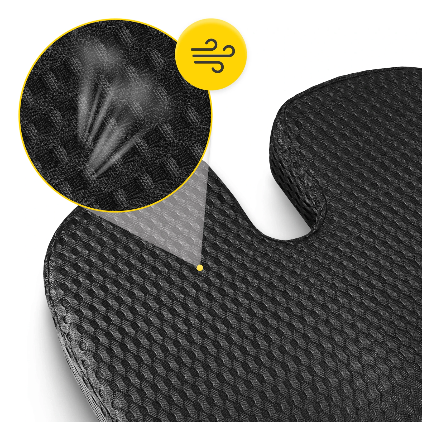Sedací polštář má ergonomický tvar, který se dokonale přizpůsobuje tvaru hýždí a stehen. Volný prostor pro kostrč je ideální pro osoby s hemoroidy, protože zmírňuje tlak v této oblasti. Polštář navíc výborně tlumí nárazy, což snižuje napětí v těle a předchází bolestem zad, včetně bolesti v bederní oblasti.