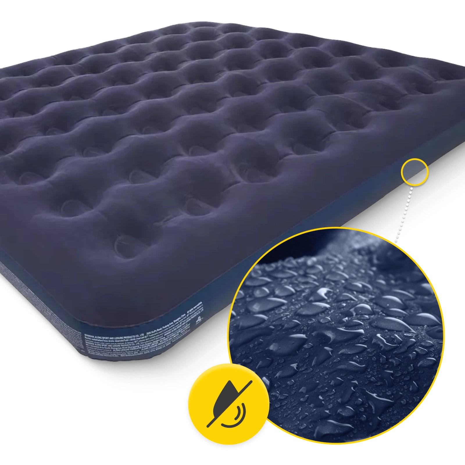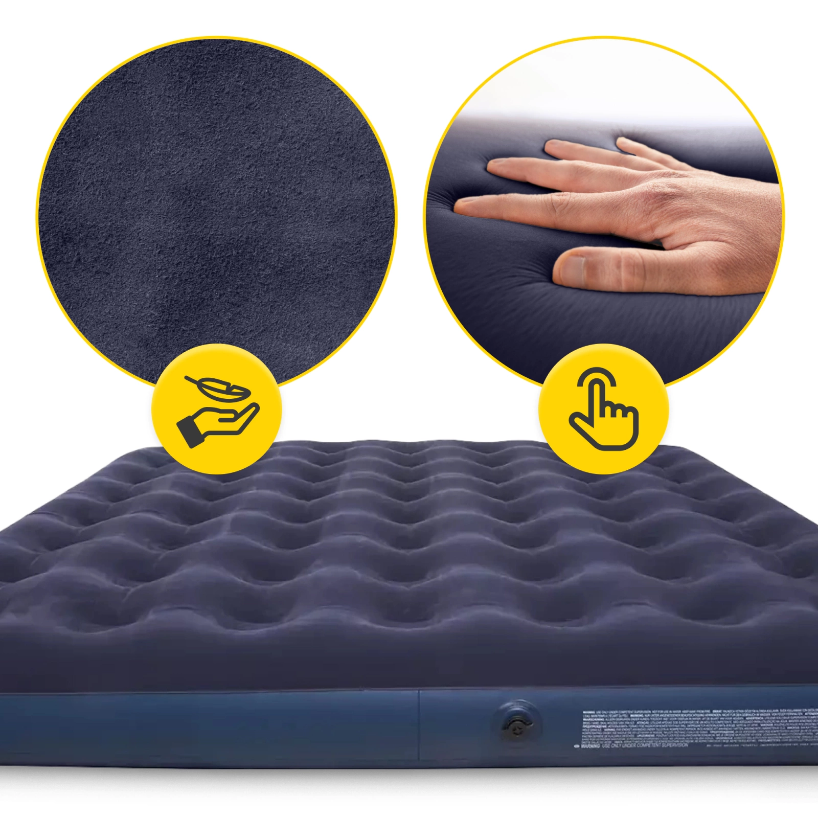 Nafukovací matrace pro dva je vyrobena z odolných materiálů, které spolehlivě izolují od země a chrání před mechanickým poškozením. Díky promyšlenému rozdělení na sekce nabízí matrace výjimečnou měkkost a pohodlí, které zklidní i náročné uživatele. Zaoblené okraje ještě víc zvyšují pocit pohodlí během ležení a její pružná struktura se skvěle přizpůsobí tvaru těla. Matrace je odolná vůči vlhkosti, takže je ideální volbou na každou cestu. Navíc měkký semišový povrch a 2 polštáře zajišťují příjemný a relaxační odpočinek.