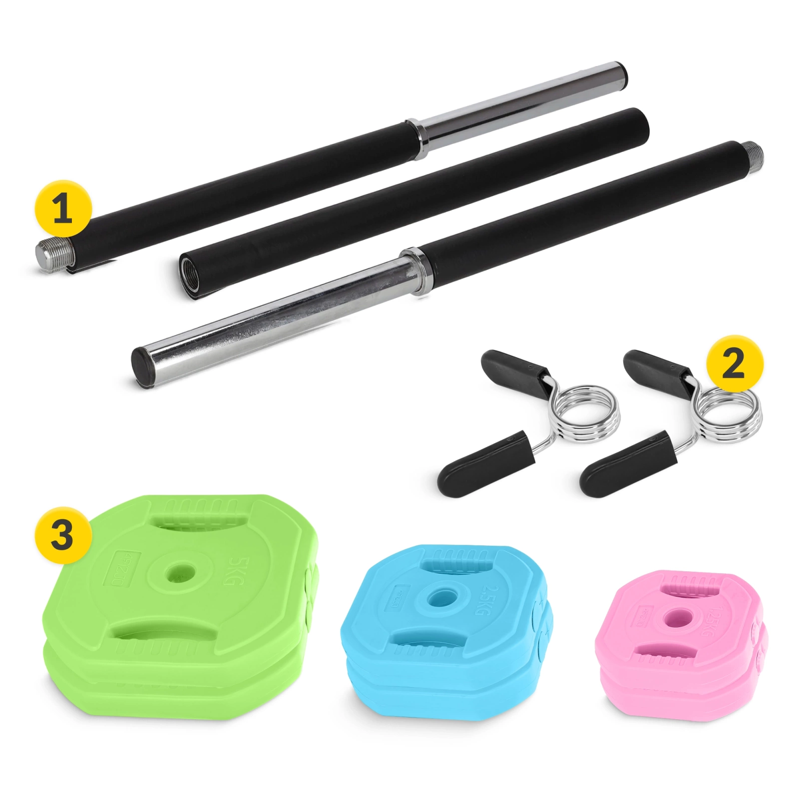 ✔️ Sada obsahuje: skládací tyč, 2 × 1,25 kg, 2 × 2,5 kg, 2 × 5 kg, 2 motýlkové zámky.