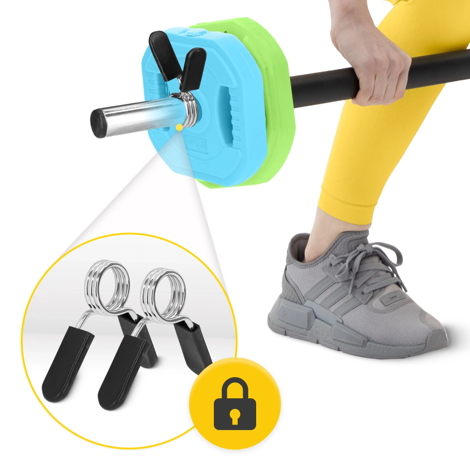 ▶️ Bezpečnostní objímky – zajišťují správné upevnění kotoučů a jejich stabilní polohu během cvičení, čímž poskytují maximální bezpečnost.