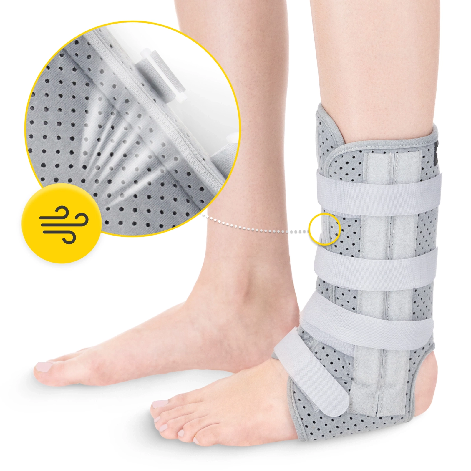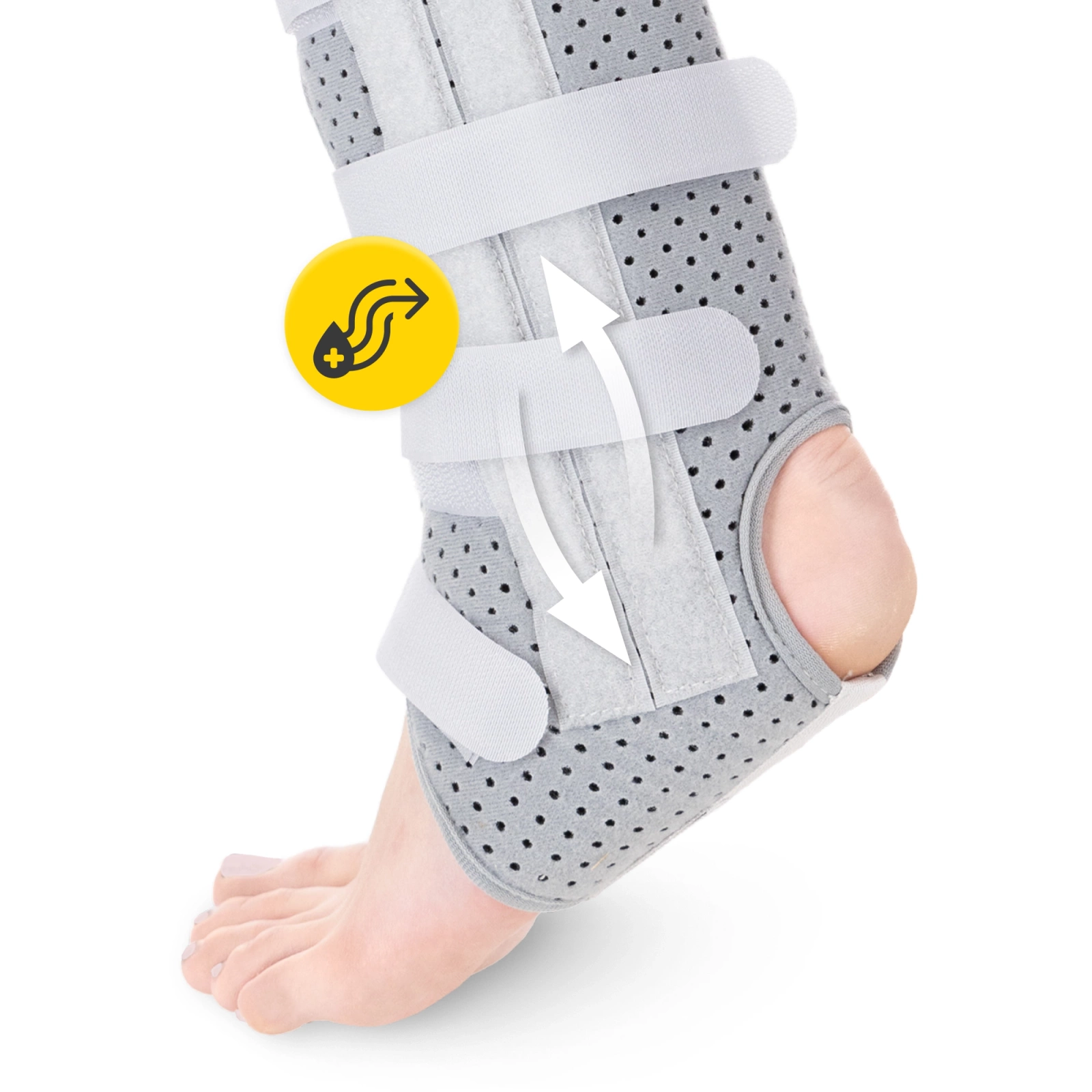 Kotníková ortéza byla navržena tak, aby se přizpůsobila anatomickému tvaru chodidla. Profilovaná konstrukce stabilizátoru zajišťuje, že se ortéza neotáčí ani nesjíždí. Pohodlné nošení zajišťuje speciální prostor na patě a jemně polstrovaný tvar.