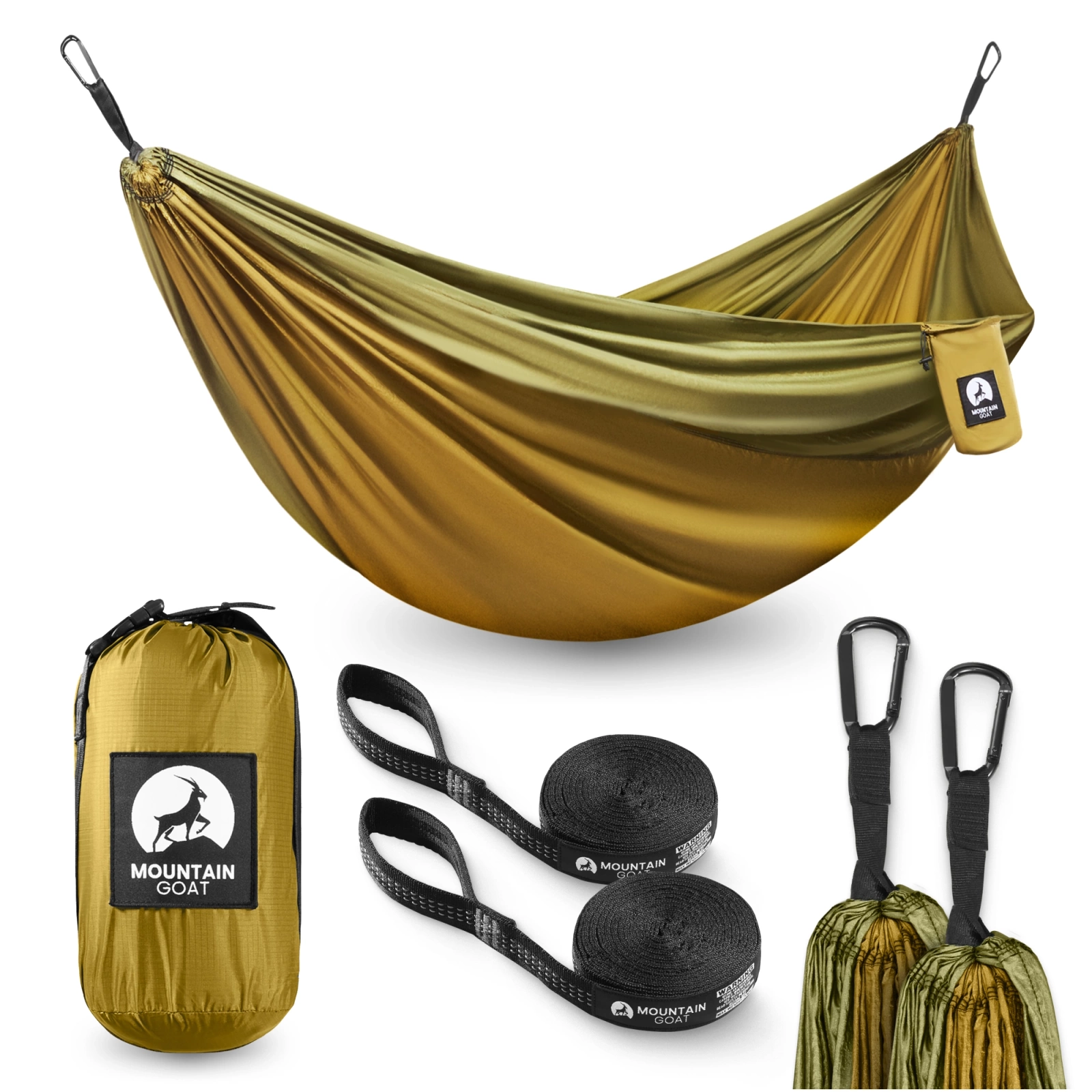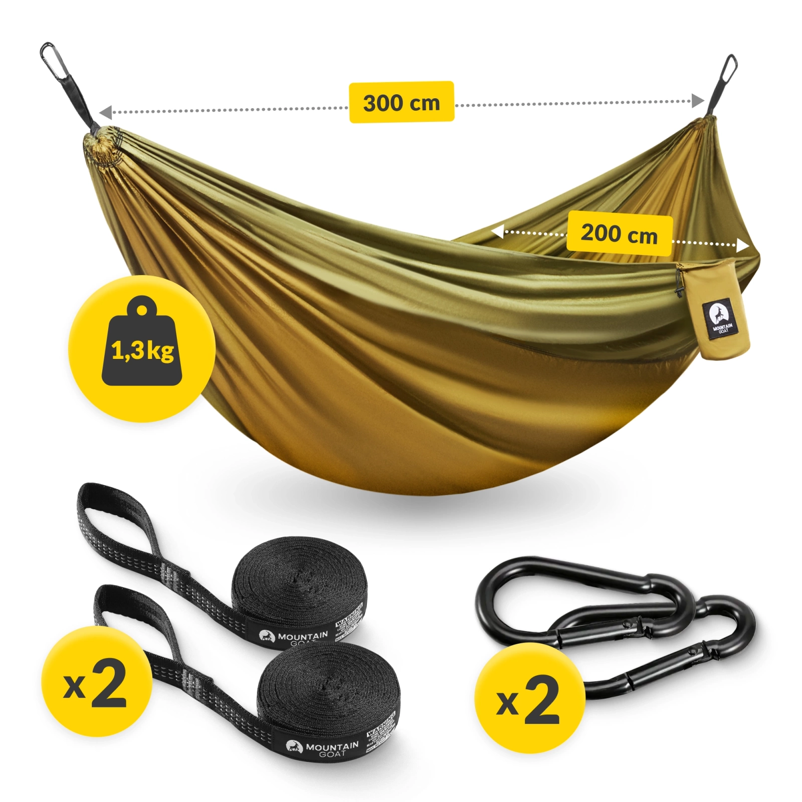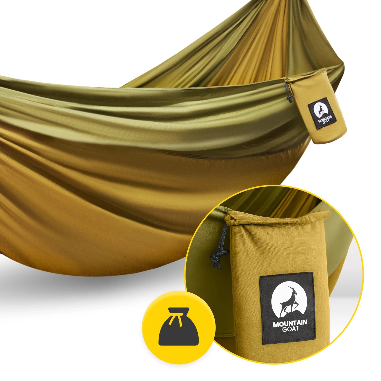 Když si pořídíte cestovní houpací síť, už se nemusíte obávat o nedostatek místa na spaní při kempování nebo na výpravách do přírody. O pohodlný spánek i odpočinek během dne se postará tato jednoduchá, ale prostorná konstrukce. Barevné provedení v odstínu vojenské zelené je navíc ideální pro bushcraft a nácvik maskování. Výhodou tohoto modelu je také použití prvotřídních výrobních materiálů. Outdoorová houpací síť MOUNTAIN GOAT je vyrobena z prodyšného a příjemného na dotek padákového nylonu 210T, který se vyznačuje vysokou odolností a schopností odolávat vlhkosti. Díky tomu představuje neocenitelnou podporu v divočině, ať už pro cestovatele, myslivce nebo přírodovědné fotografy.