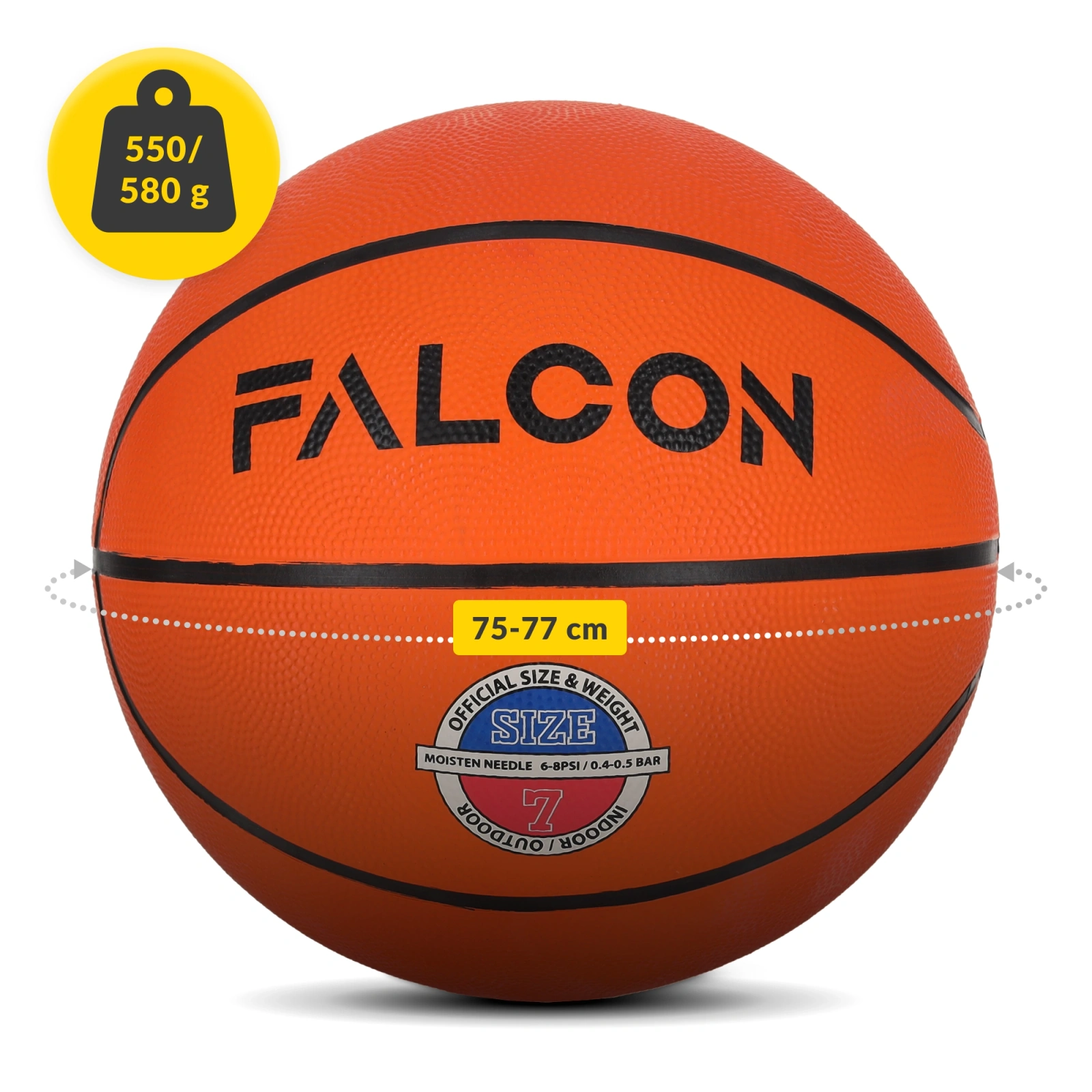 ▶️ Velikost 7: průměr 75-77 cm, hmotnost 550-600 g – oficiální velikost pro chlapce od 15 let a pro muže. Jedná se o standardní míč používaný v profesionálních ligách, jako NBA nebo FIBA.