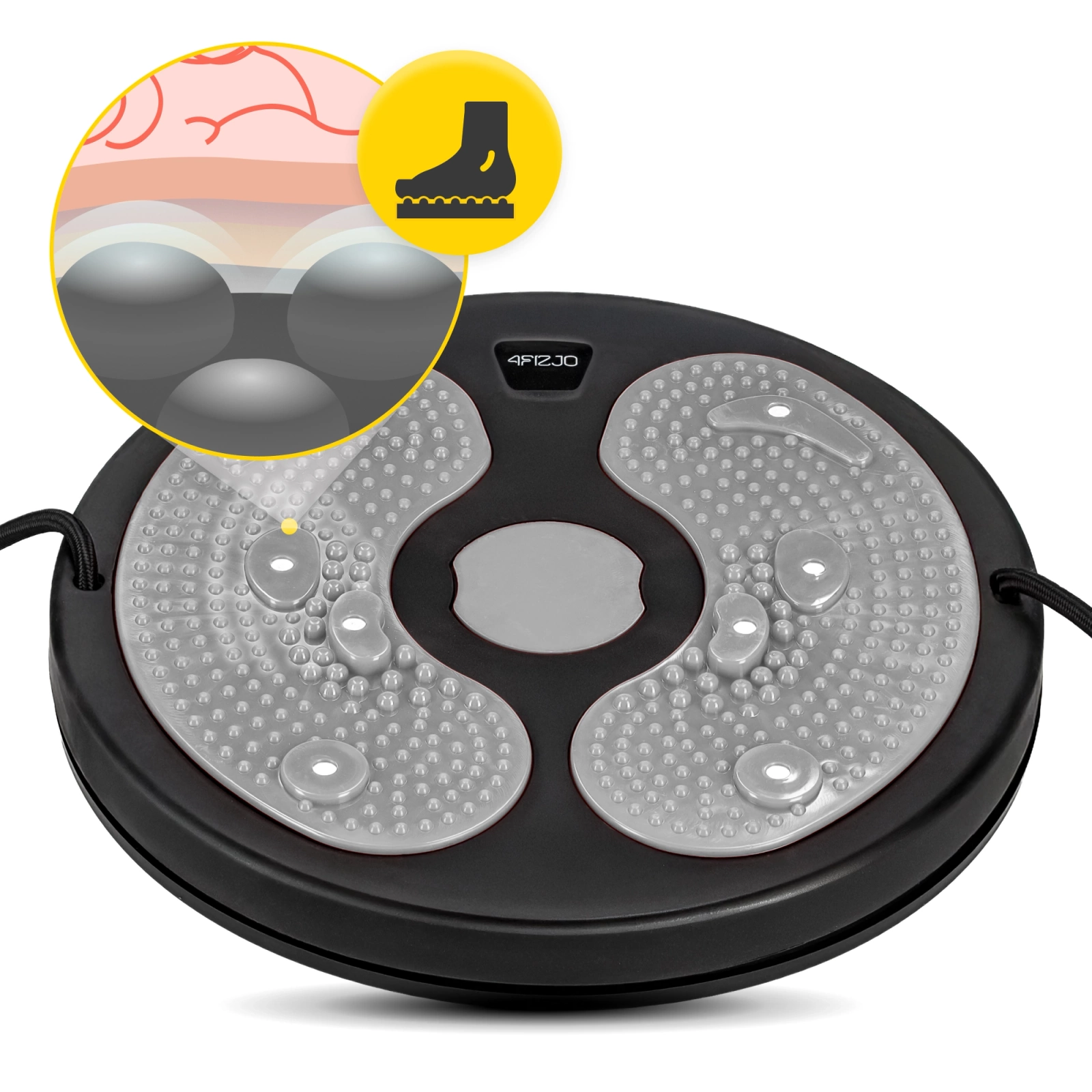 Rotační disk 4FIZJO umožňuje komplexní trénink celého těla. Díky odolné konstrukci a kvalitním materiálům je cvičení efektivní a bezpečné. Dva elastické posilovací popruhy s úchyty, které lze otáčet, zajišťují intenzivnější trénink. Jejich výhodou je, že umožňují současně zapojit paže, pas i boky. Navíc speciální masážní výstupky na povrchu zlepšují přilnavost a poskytují příjemnou senzorickou masáž chodidel. Tyto prvky zároveň pomáhají udržet stabilitu a kontrolu nad tělem během cvičení. Rotační mini disk s provazy je ideální volbou pro začátečníky i pokročilé.