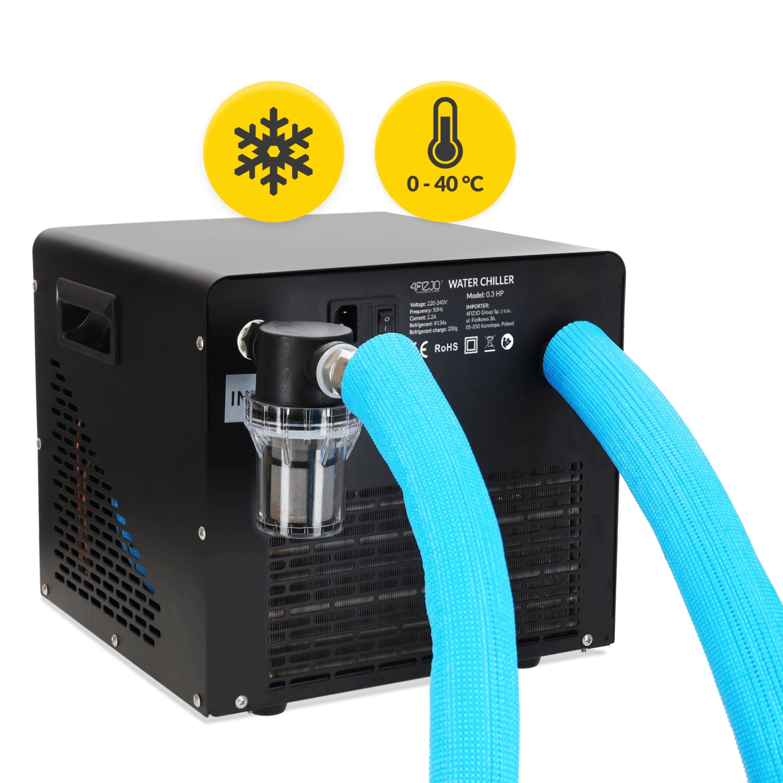 Chiller 4FIZJO je spolehlivé zařízení určené k ochlazování vody během ledových koupelí. Kombinuje funkci chlazení s udržením stabilní teploty. Tento chladicí systém je plně kompatibilní se sudem na otužování PRO 4FIZJO. Jeho obsluha je jednoduchá a intuitivní – stačí jej připojit k vaně, nastavit požadovanou teplotu a vychutnat si zasloužený relax. O pohodlí a snadné používání se stará přehledný ovládací panel s LED displejem a tlačítky, pomocí kterých nastavíte cílovou teplotu v rozmezí 0 °C až 40 °C.