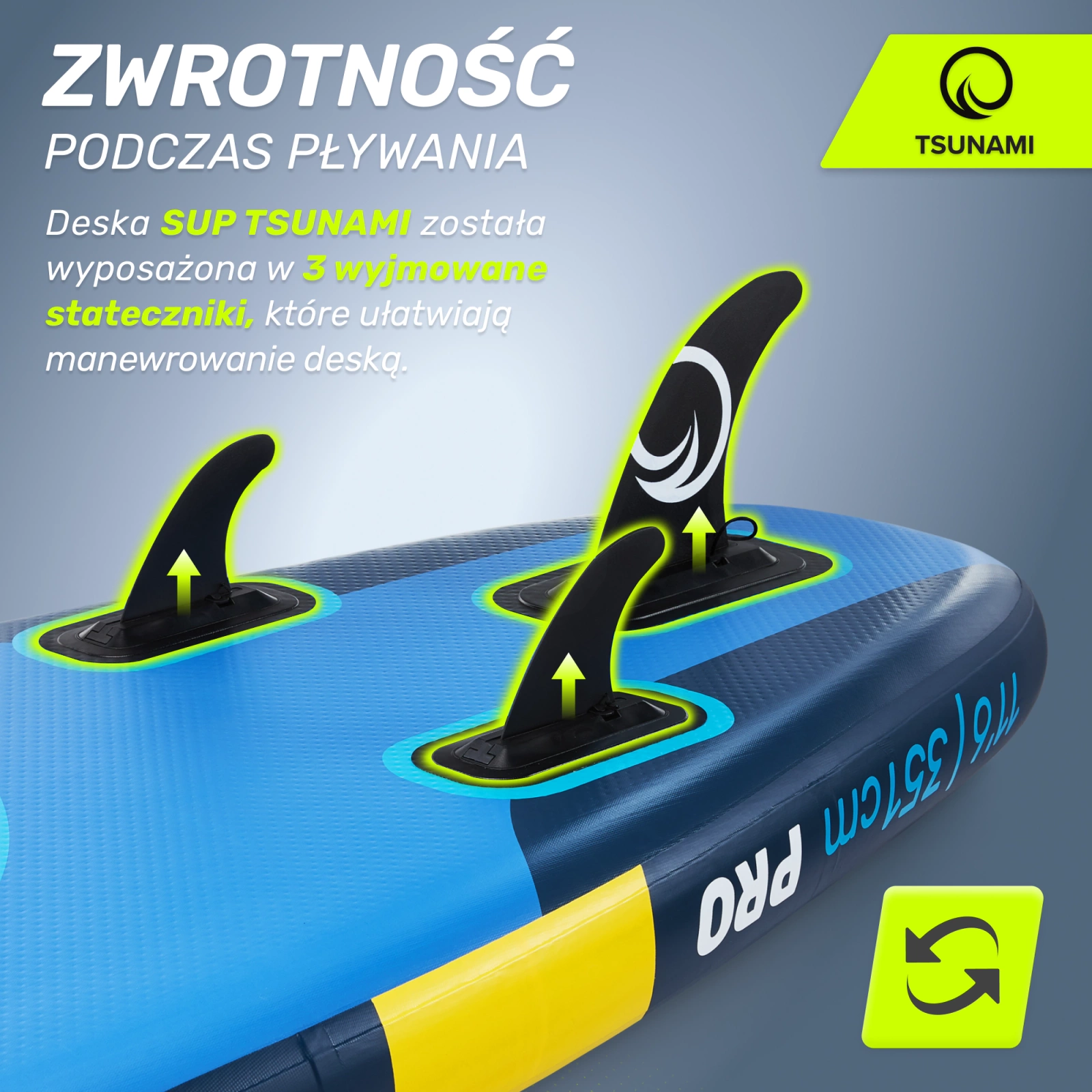 Na komfort a bezpečnost při plavání na paddleboardu SUP PRO má velký vliv také jeho obratnost. Zde není místo pro kompromisy! Proto byl paddleboard SUP PRO TSUNAMI vybaven hned 3 ploutvemi, které usnadňují manévrování prknem. Kromě toho je součástí sady i ergonomicky tvarované pádlo, které bylo navrženo tak, aby pádlo zachytávalo více vody, což zaručuje efektivnější pádlování a ještě snazší ovládání prkna.