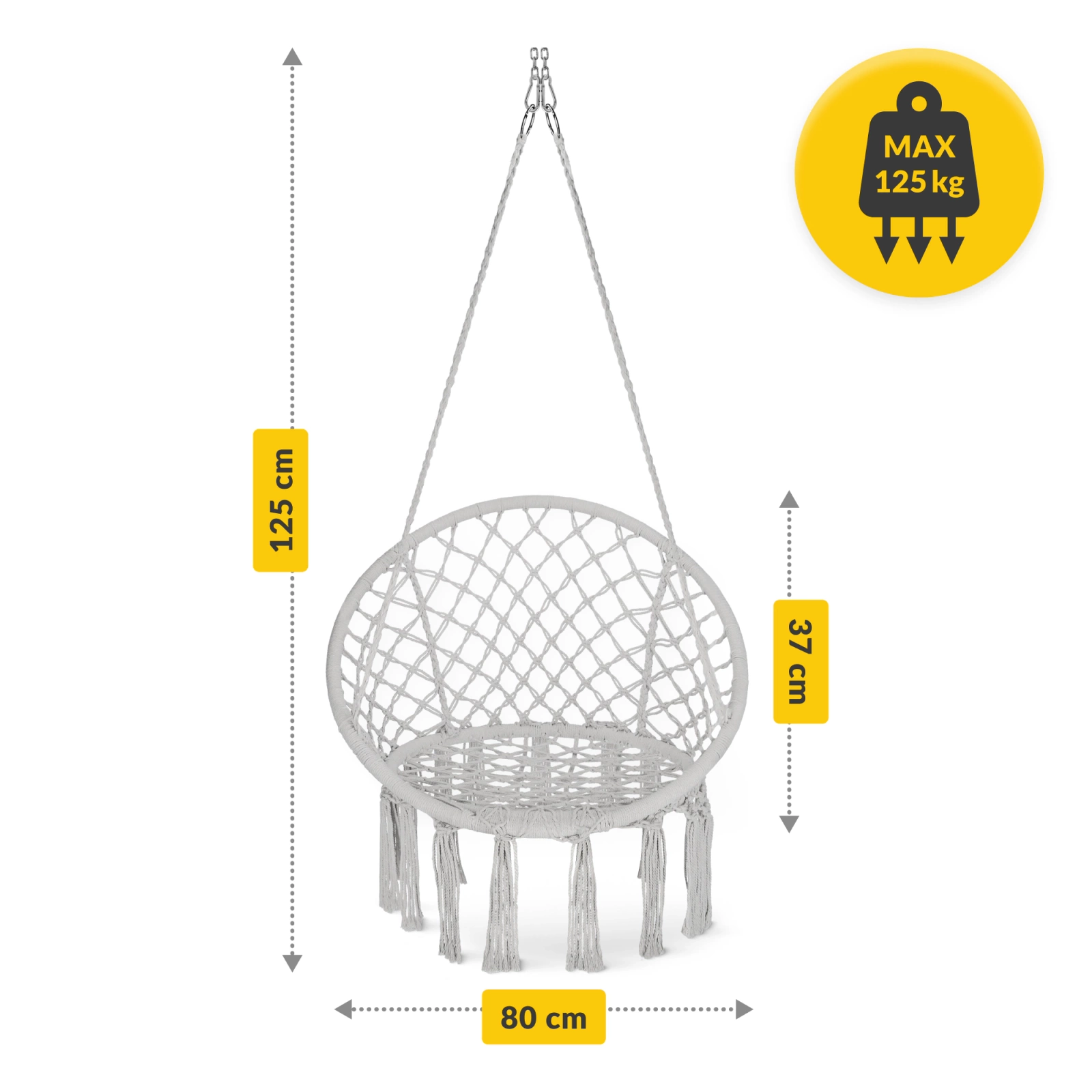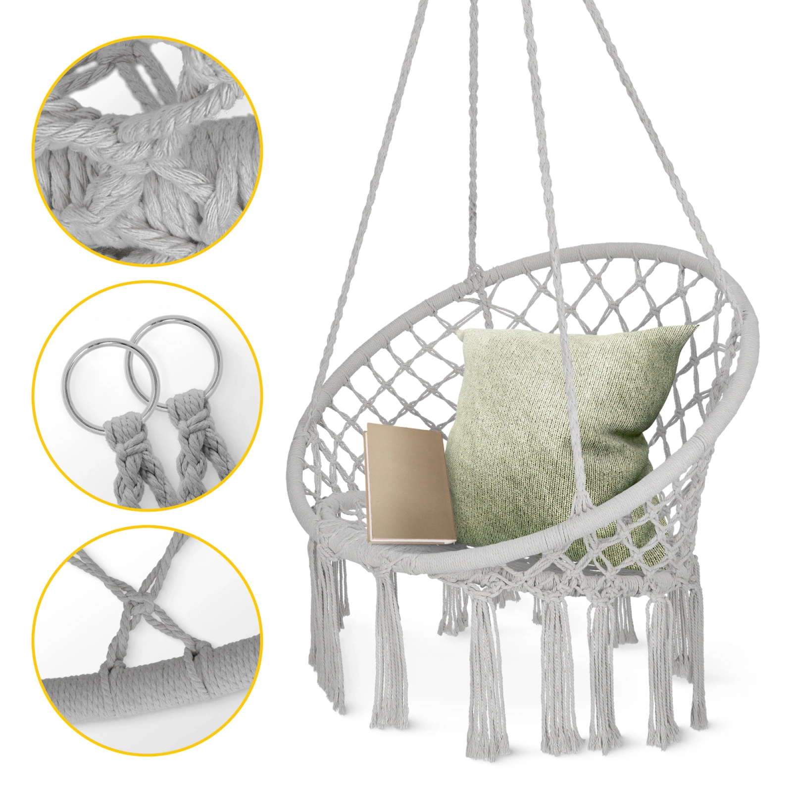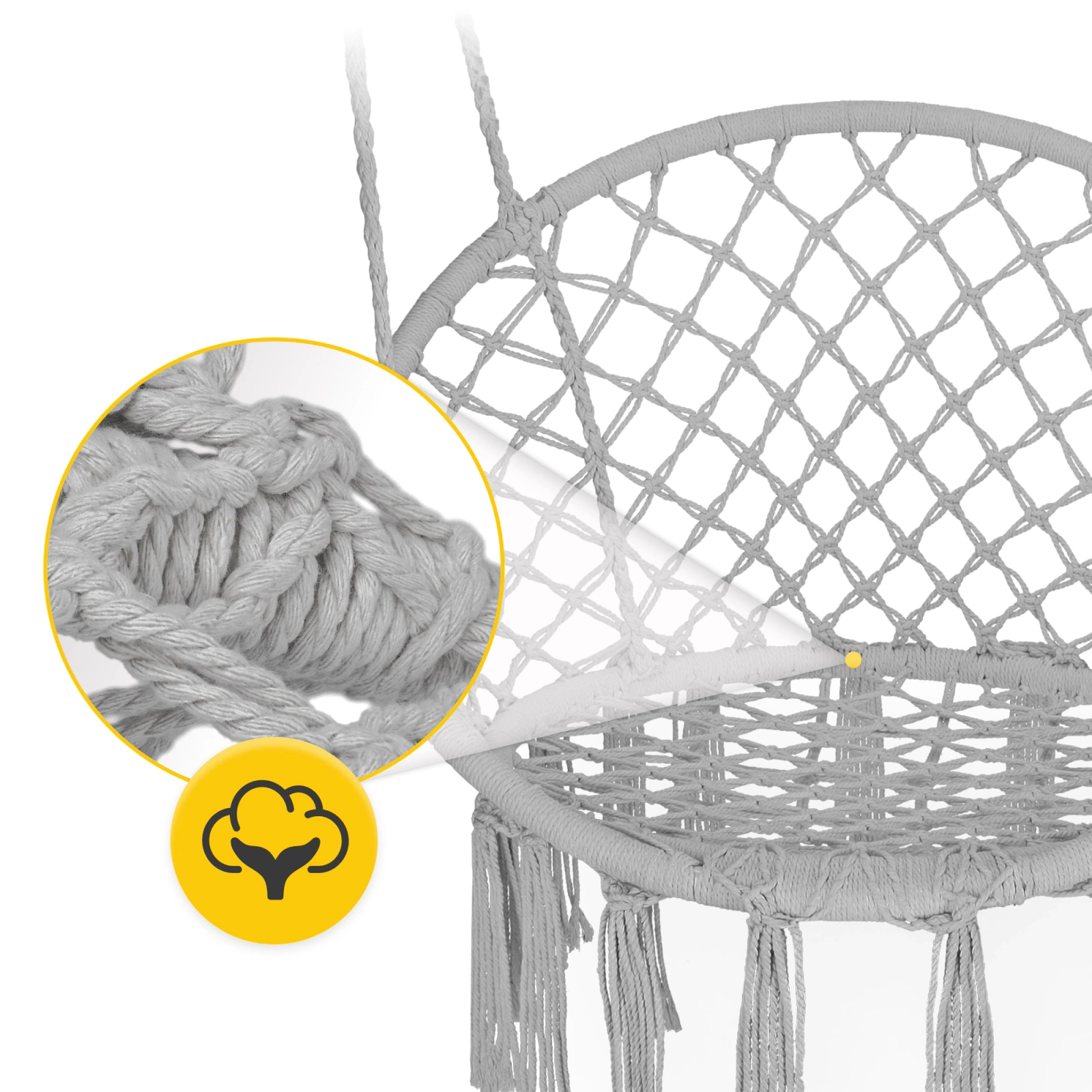 Zahradní houpačka BOHO je vyrobena z těch nejkvalitnějších výrobních materiálů. Bavlněné, na dotek příjemné provazy zajišťují vysoký komfort během používání. Závěsné křeslo se navíc vyznačuje pevnou konstrukcí a odolnými lany. To vše zaručuje bezpečí a stabilitu při sezení. Jemná barevnost, decentní makramové pletení a rustikální detaily, jako například třásně visící ze sedáku, dodávají houpačce jedinečný styl inspirovaný přírodou.