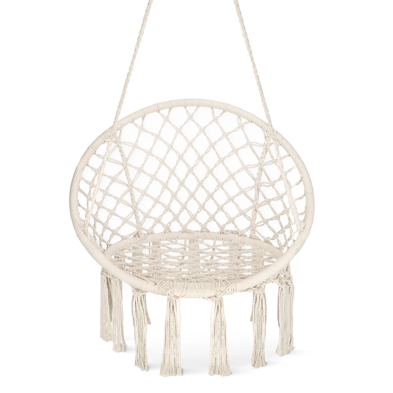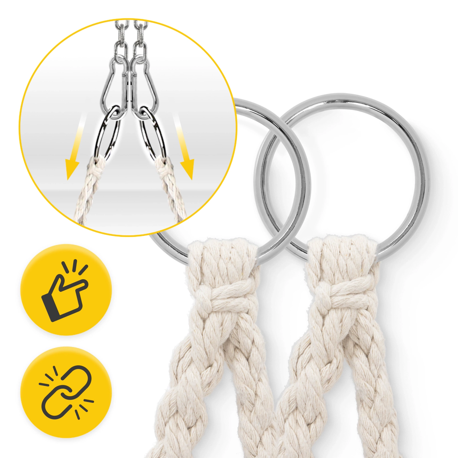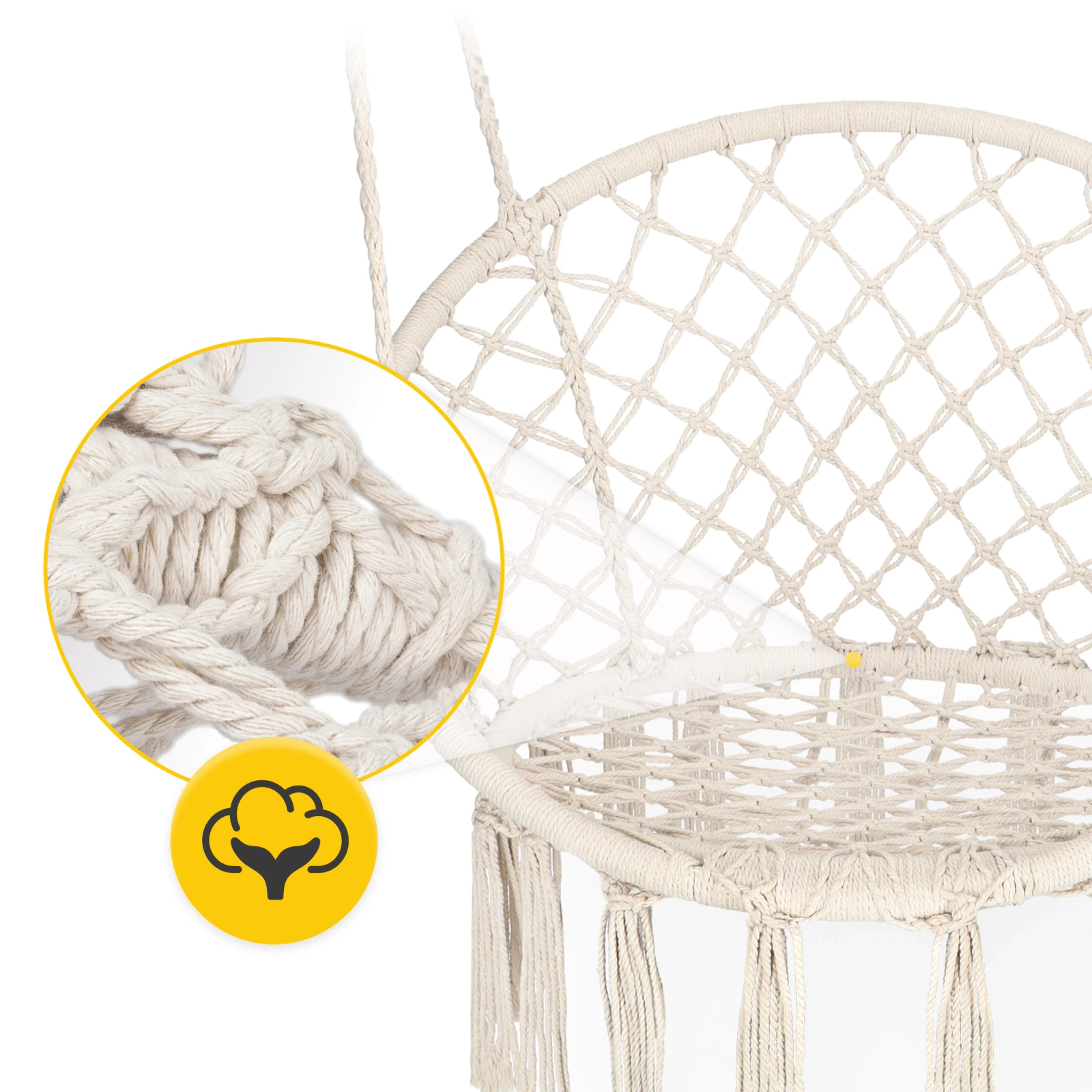 Zahradní houpačka BOHO je vyrobena z těch nejkvalitnějších výrobních materiálů. Bavlněné, na dotek příjemné provazy zajišťují vysoký komfort během používání. Závěsné křeslo se navíc vyznačuje pevnou konstrukcí a odolnými lany. To vše zaručuje bezpečí a stabilitu při sezení. Jemná barevnost, decentní makramové pletení a rustikální detaily, jako například třásně visící ze sedáku, dodávají houpačce jedinečný styl inspirovaný přírodou.