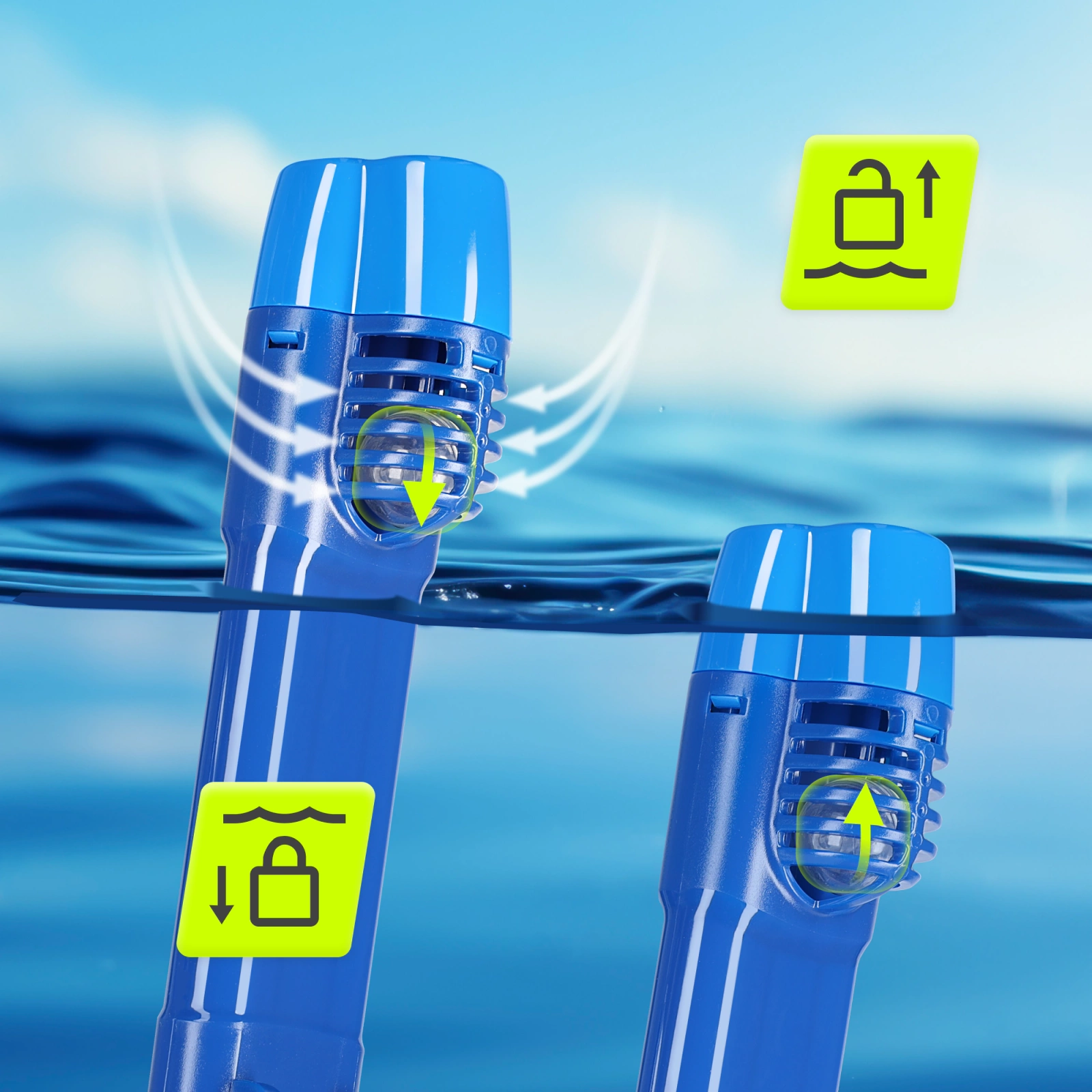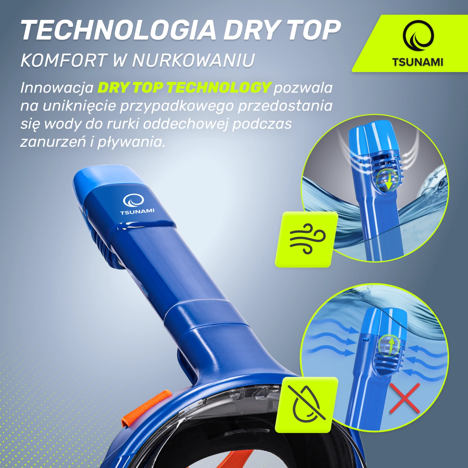 Inovativní technologie DRY TOP použitá u šnorchlu masky pro potápění účinně zabraňuje pronikání vody dovnitř masky. Speciální konstrukce šnorchlu, která je vybavená kuličkou, umožňuje volné dýchání během šnorchlování. Jakmile se potápěč zcela ponoří, kulička automaticky zablokuje otvor ve šnorchlu, čímž zabrání vniknutí vody dovnitř. Díky tomuto řešení je riziko zadýchávání vodou minimální, což zvyšuje komfort a bezpečnost během potápění.