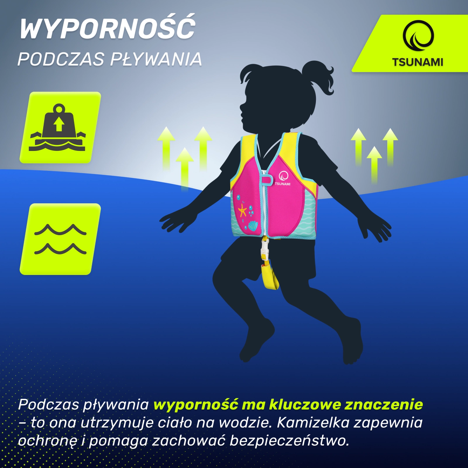 Při navrhování vesty TSUNAMI jsme dbali nejen na bezpečnost spojenou s výtlakem, ale také na pohodlí těch nejmenších uživatelů. Měkká pěna netlačí ani neomezuje pohyb, zatímco neoprenový materiál se skvěle přizpůsobí tělu. Vyjímatelné vložky umožňují přizpůsobit vztlak úrovni plaveckých dovedností dítěte – díky tomu vesta „roste“ spolu s ním a poskytuje oporu v každé fázi výuky plavání.