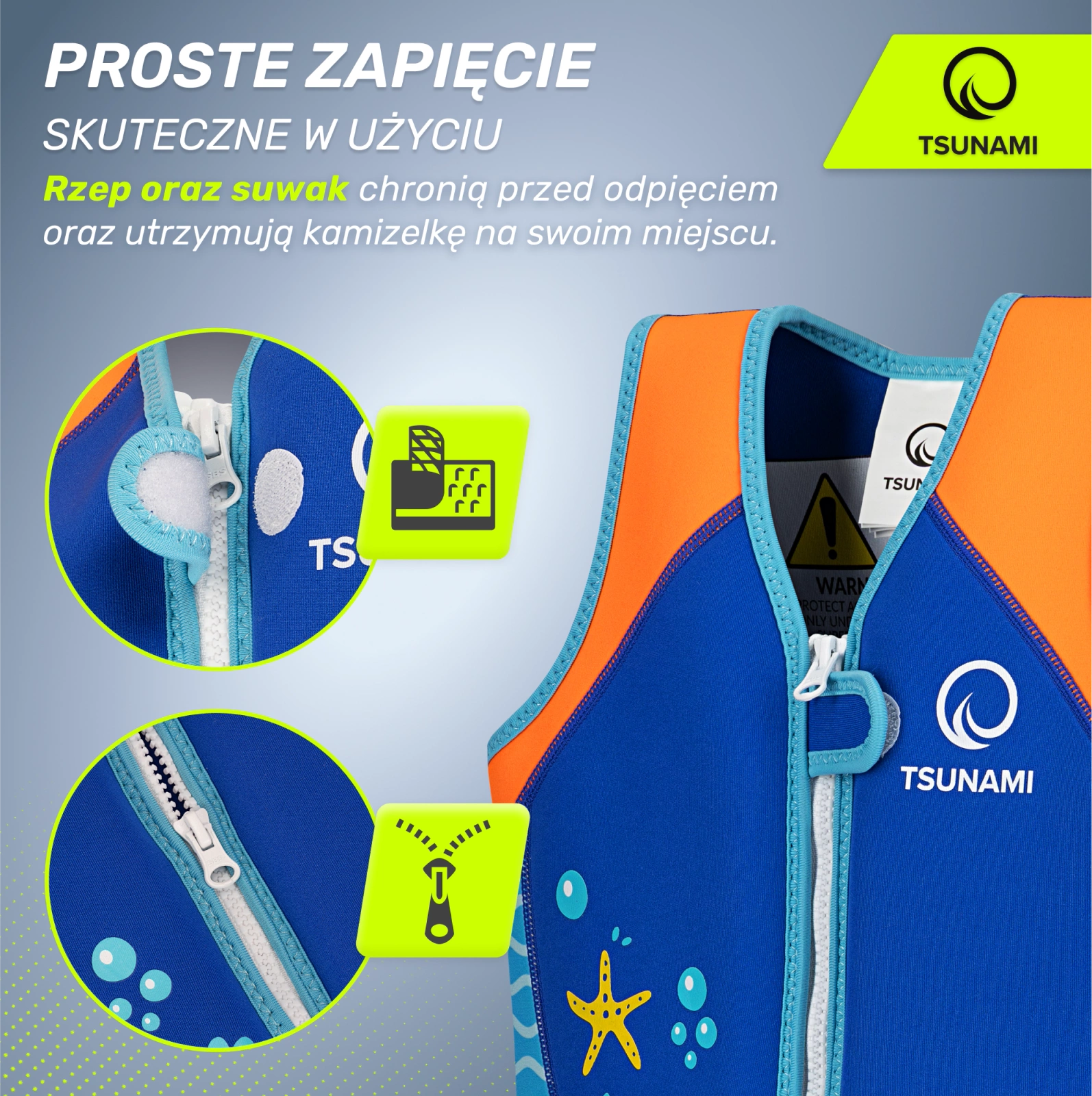Chystáte se s dítětem k vodě a přemýšlíte, jak zajistit jeho bezpečí? Ručník, opalovací krém s ochranným faktorem a klobouk jsou dobrý začátek – ale je tu ještě něco, co by rozhodně nemělo chybět. Plovací vesta TSUNAMI pro začátečníky pomůže vašemu dítěti si zvyknout na vodu, udržet rovnováhu a získat sebedůvěru při prvních hrách ve vodě.