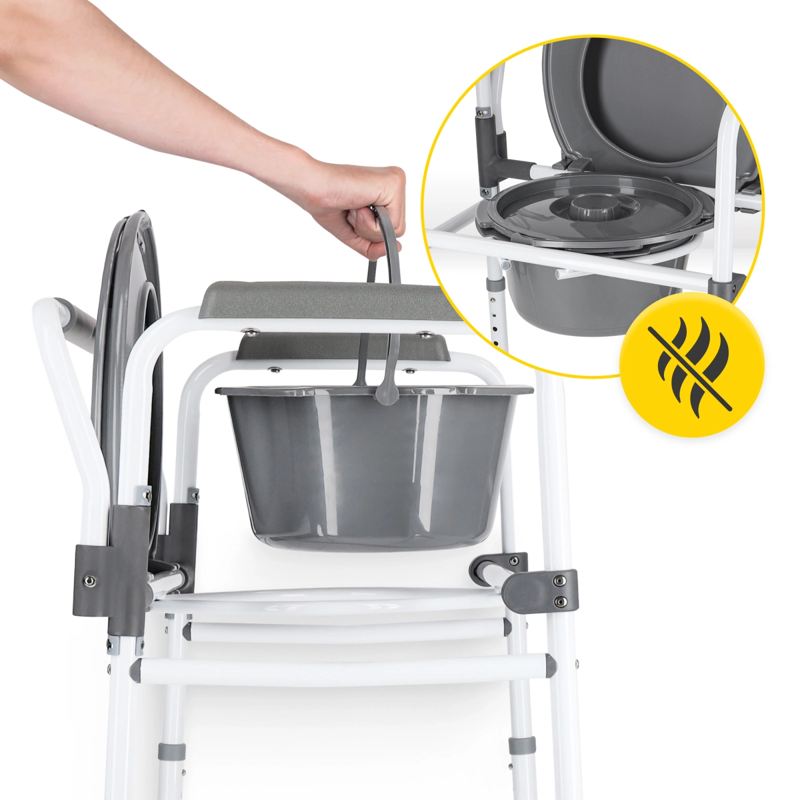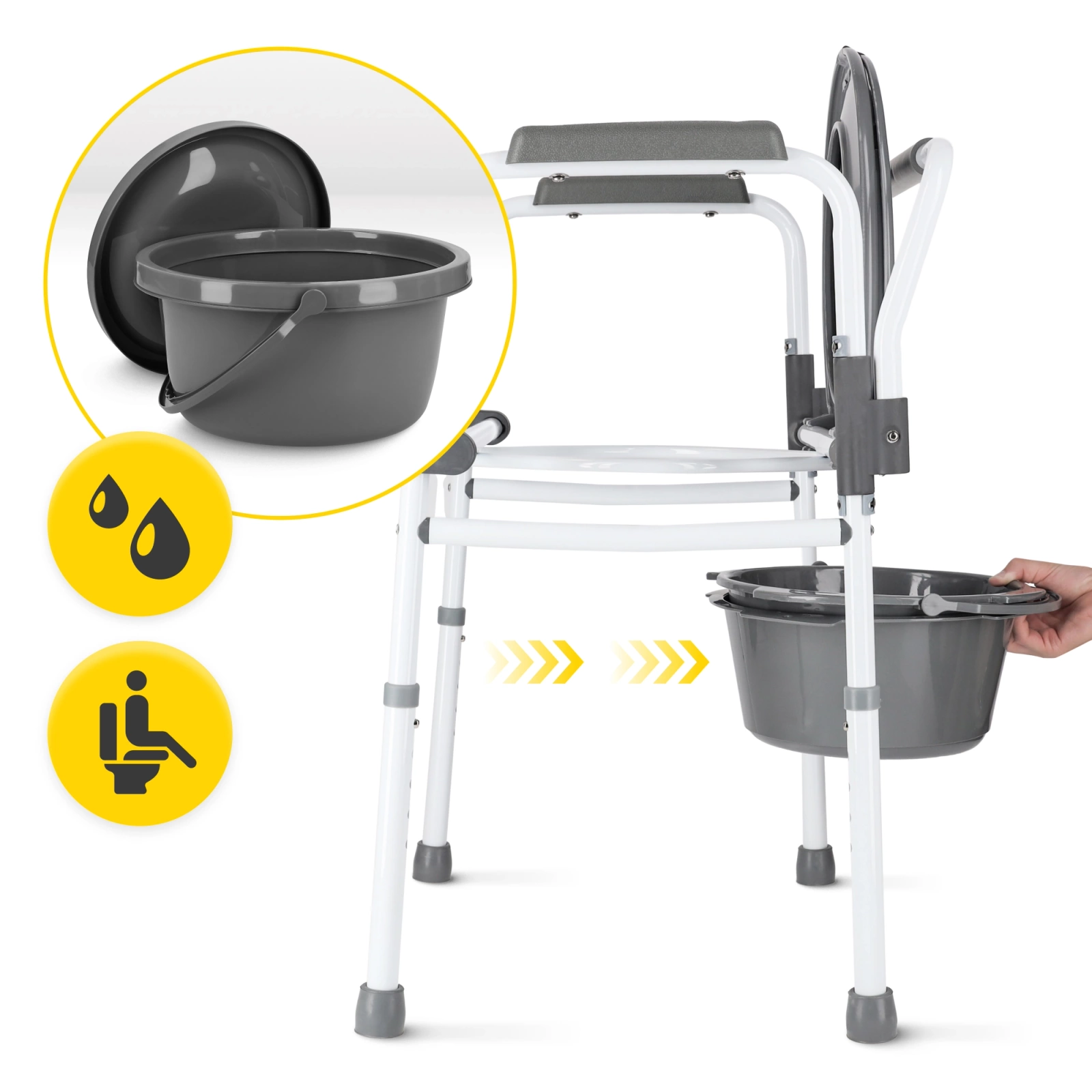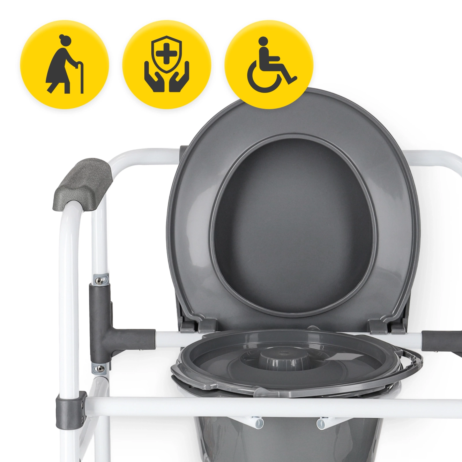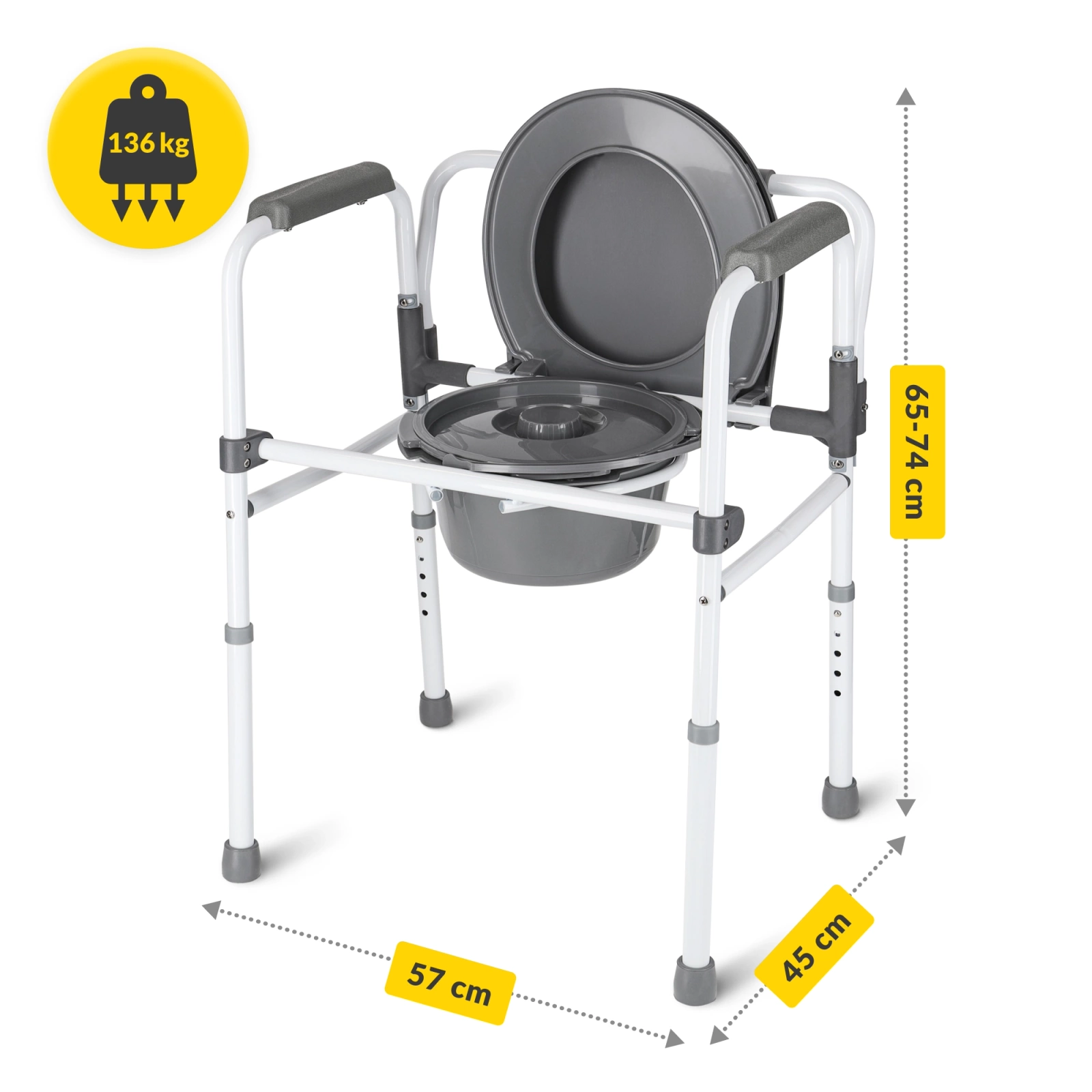 ✔️Klíčové vlastnosti: nastavitelná výška sedátka, sanitární nádoba s víkem, područky usnadňující vstávání, protiskluzové gumové patky