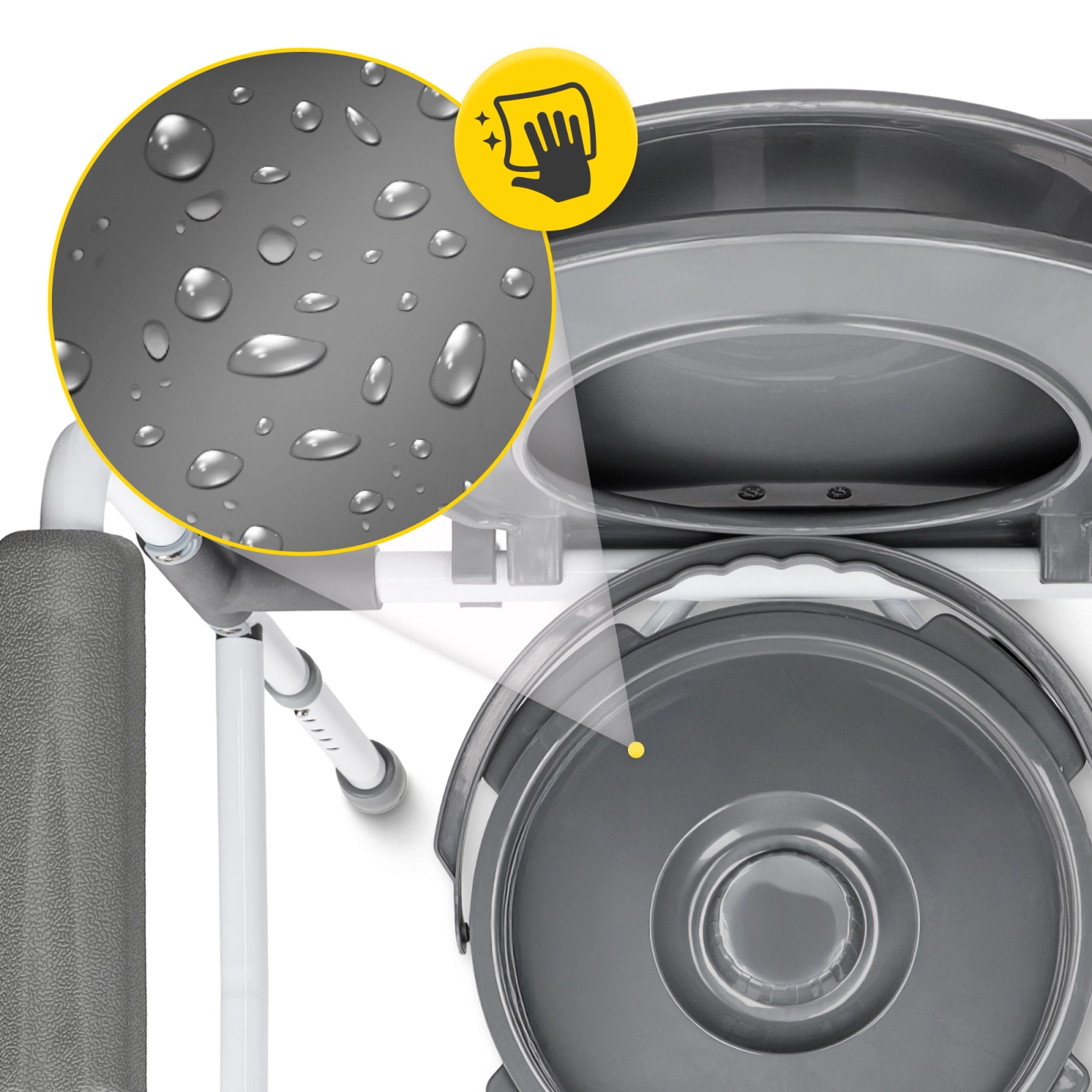 Pevný ocelový rám zaručuje vysokou odolnost, zatímco nastavitelná výška sedátka umožňuje přizpůsobit křeslo výšce postavy i individuálním potřebám. Sedátko s vyjímatelnou nádobou umožňuje snadné vyprázdnění a zachování hygieny, přičemž područky poskytují dodatečnou oporu při vstávání a sedání.Toaletní křeslo 3 v 1 s nastavením výšky