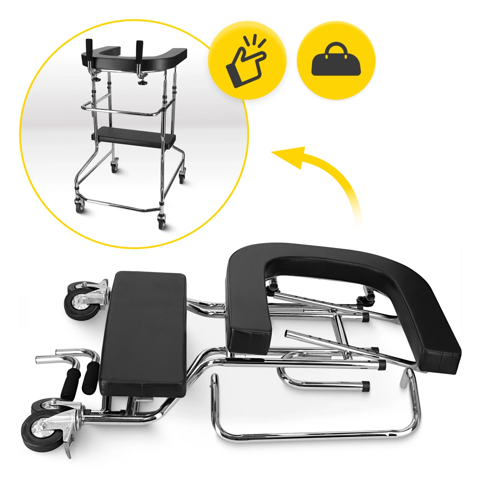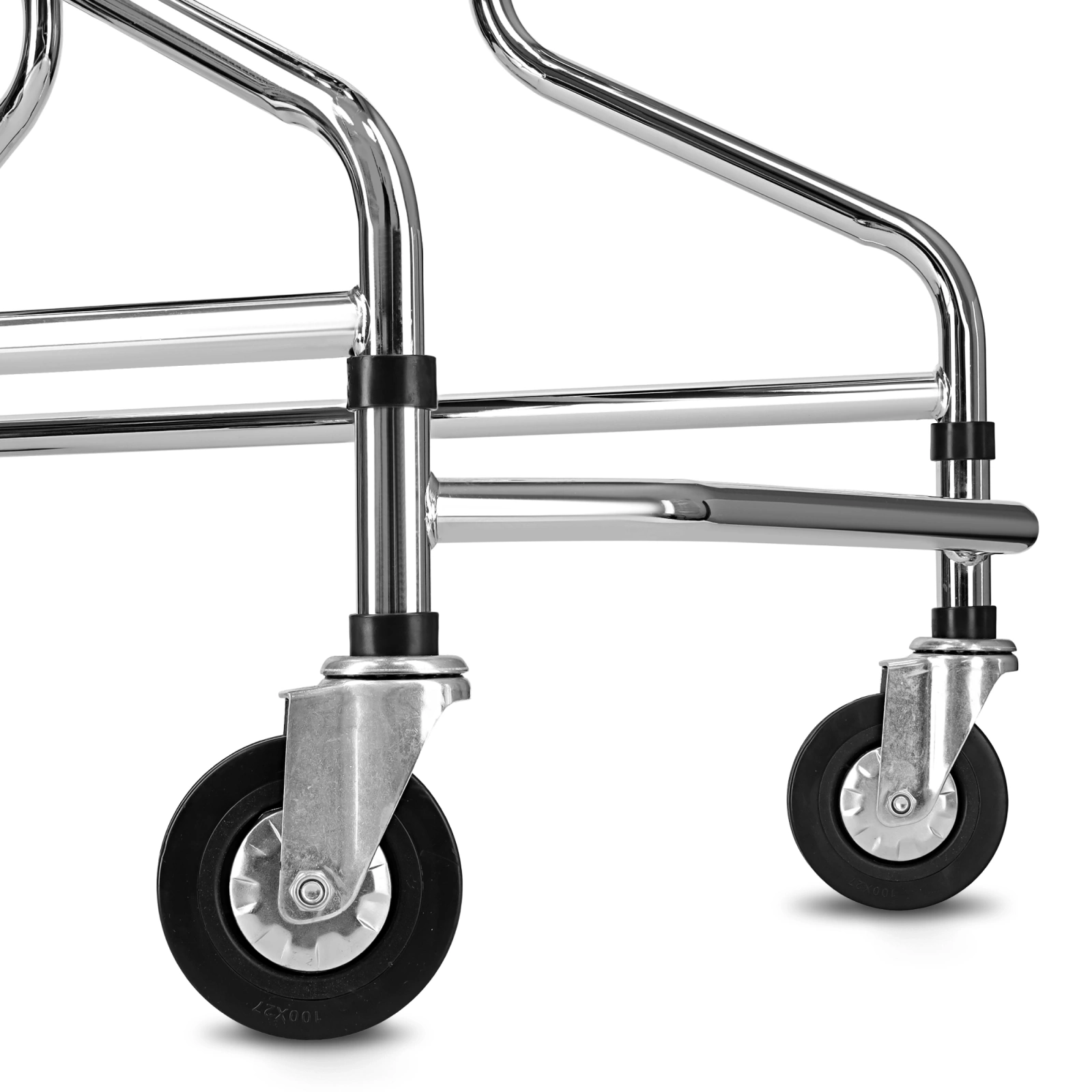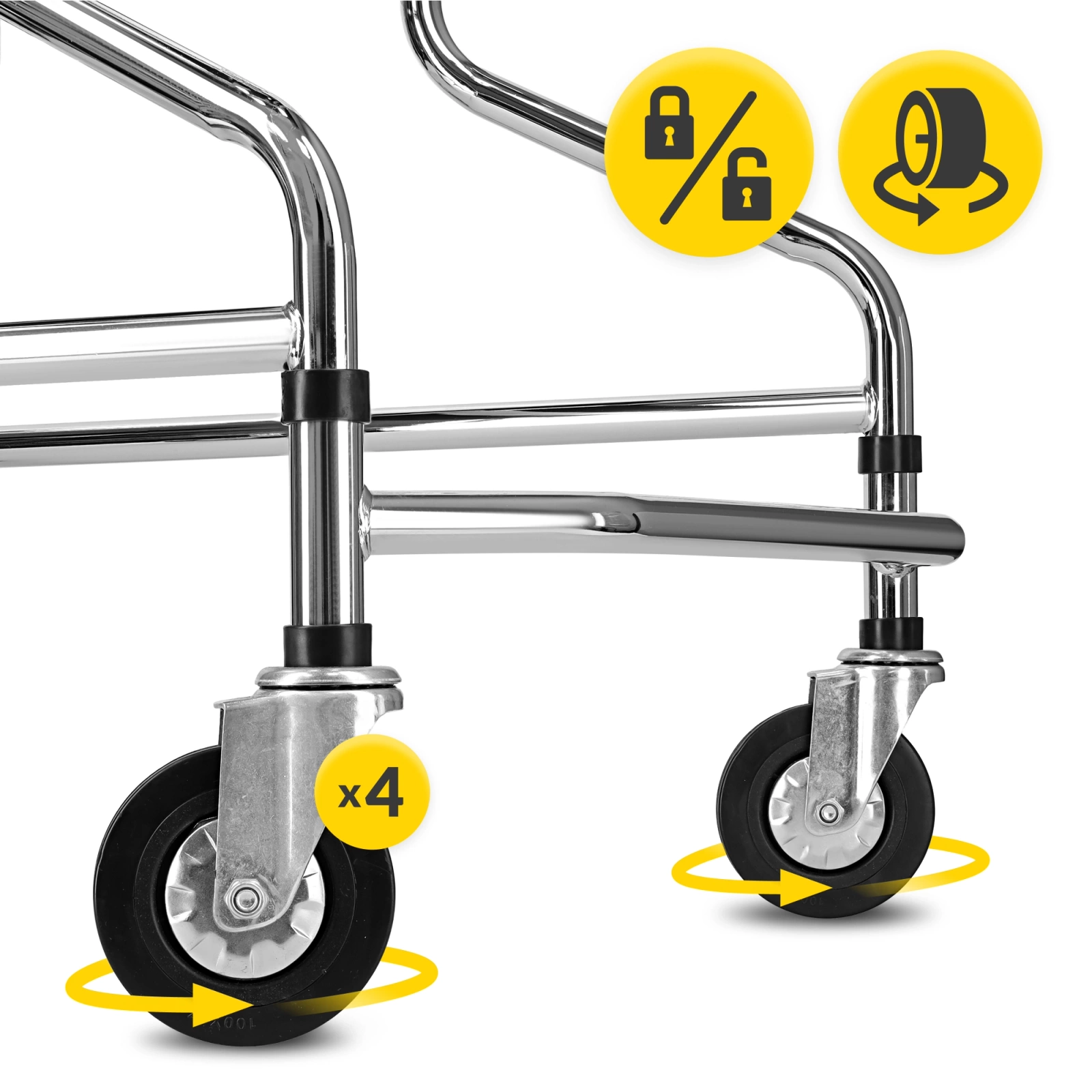 • Stabilita a jistota v každém kroku – pevná ocelová konstrukce a čtyři kola s brzdami poskytují jistotu a kontrolu při pohybu.