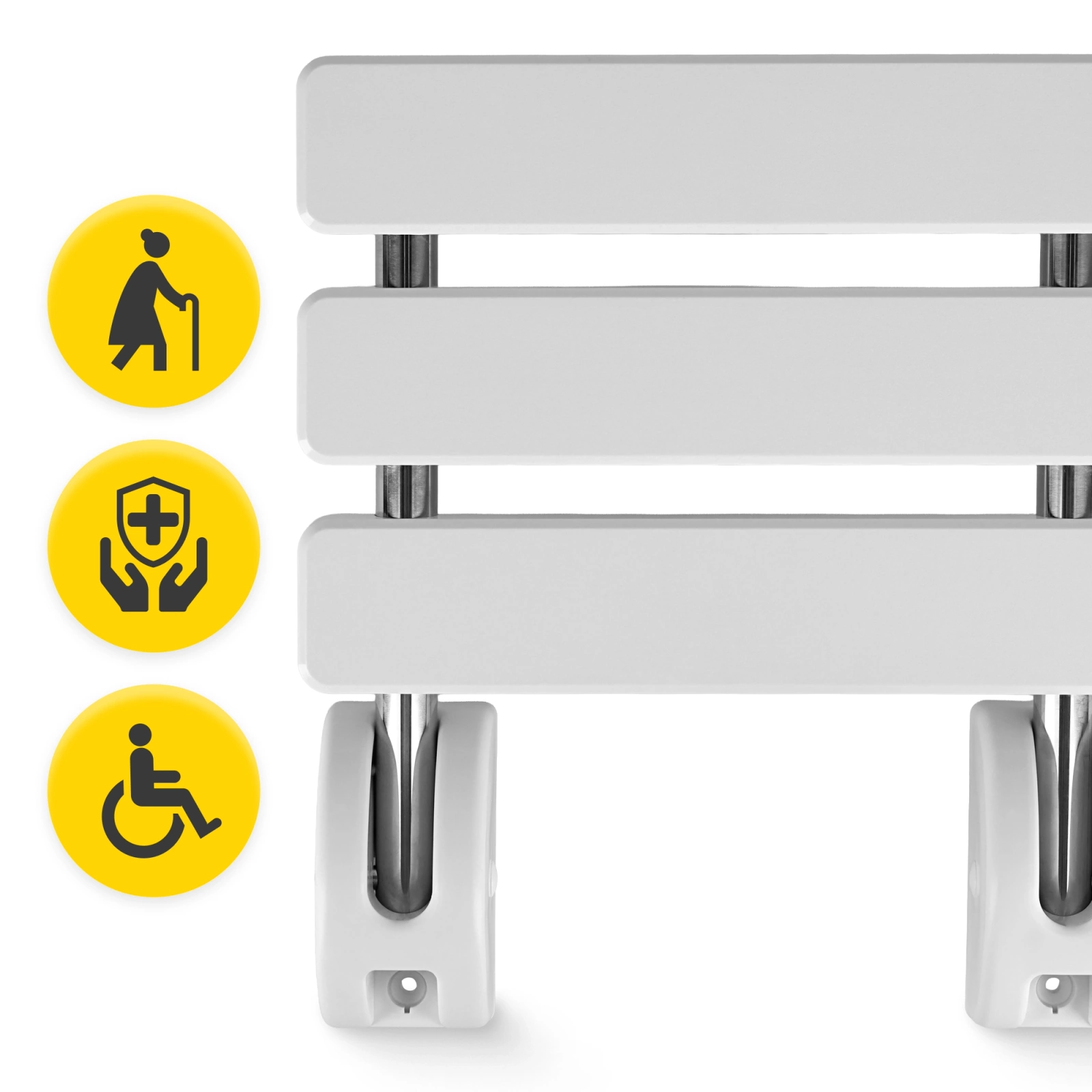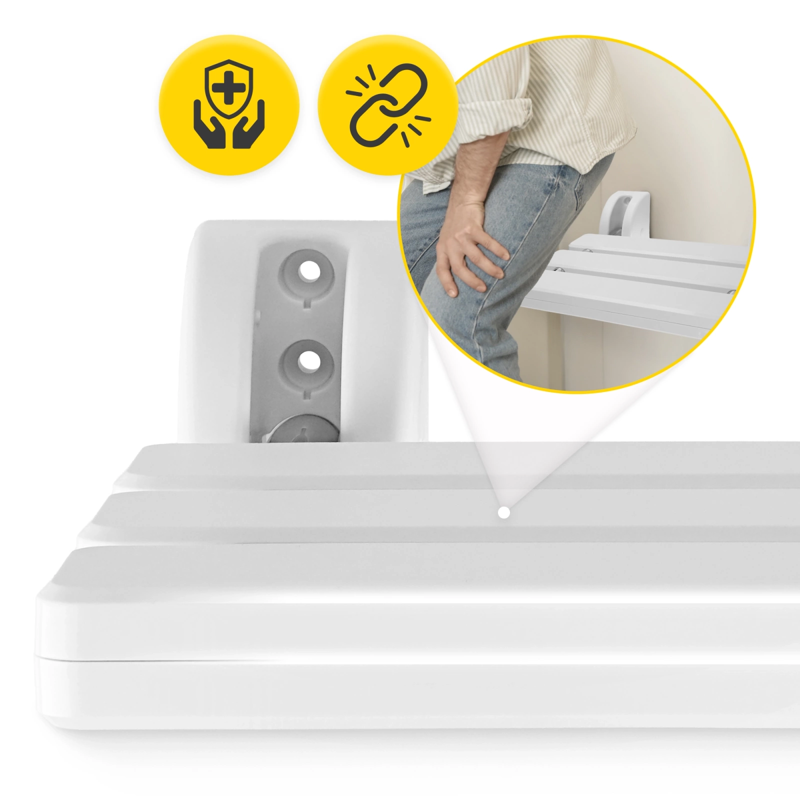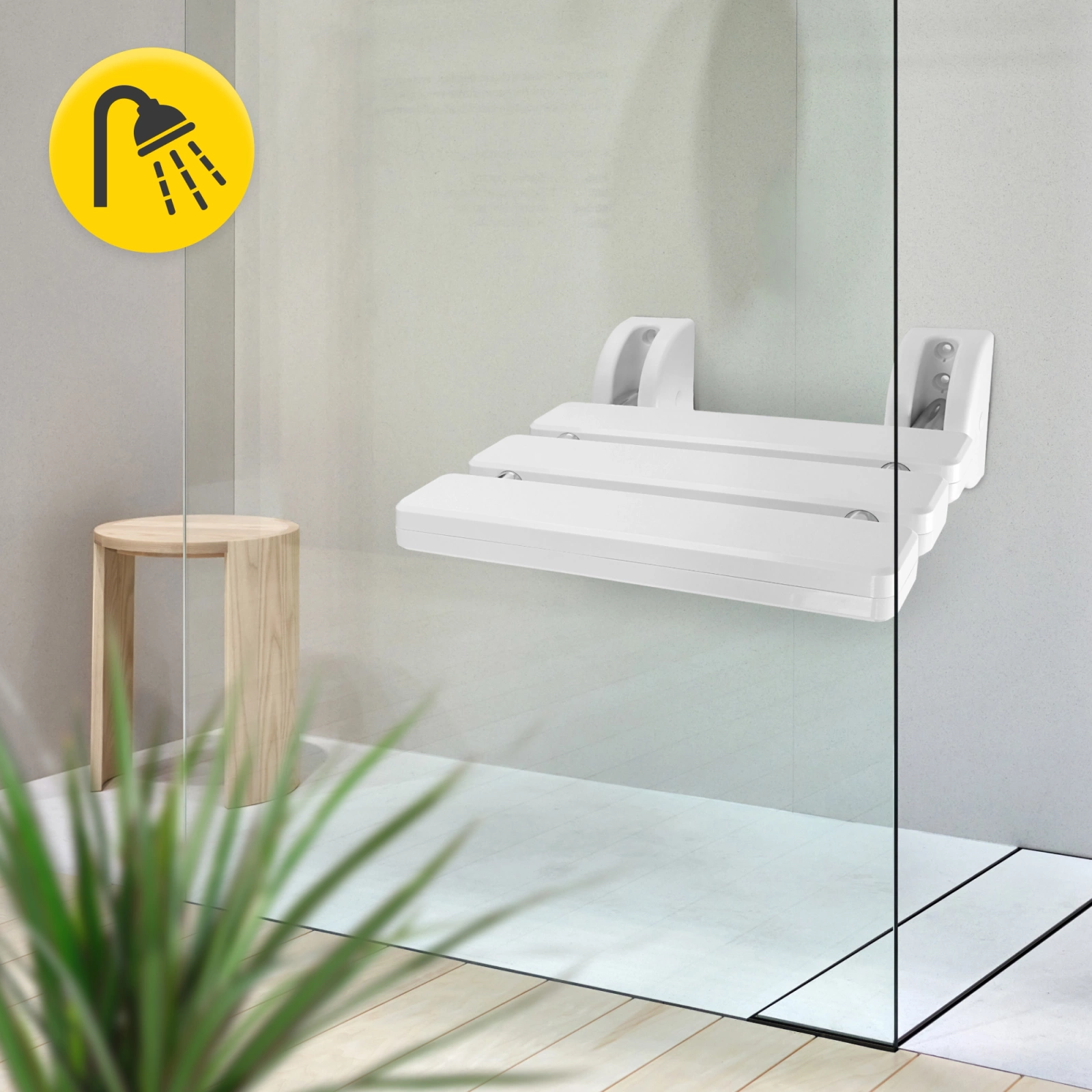 Díky pevné montáži ke zdi a skládací funkci umožňuje sprchové sedátko šetřit místo, když není používáno. Je to ideální volba pro sprchové kouty v bytech, pečovatelských domech i nemocnicích.