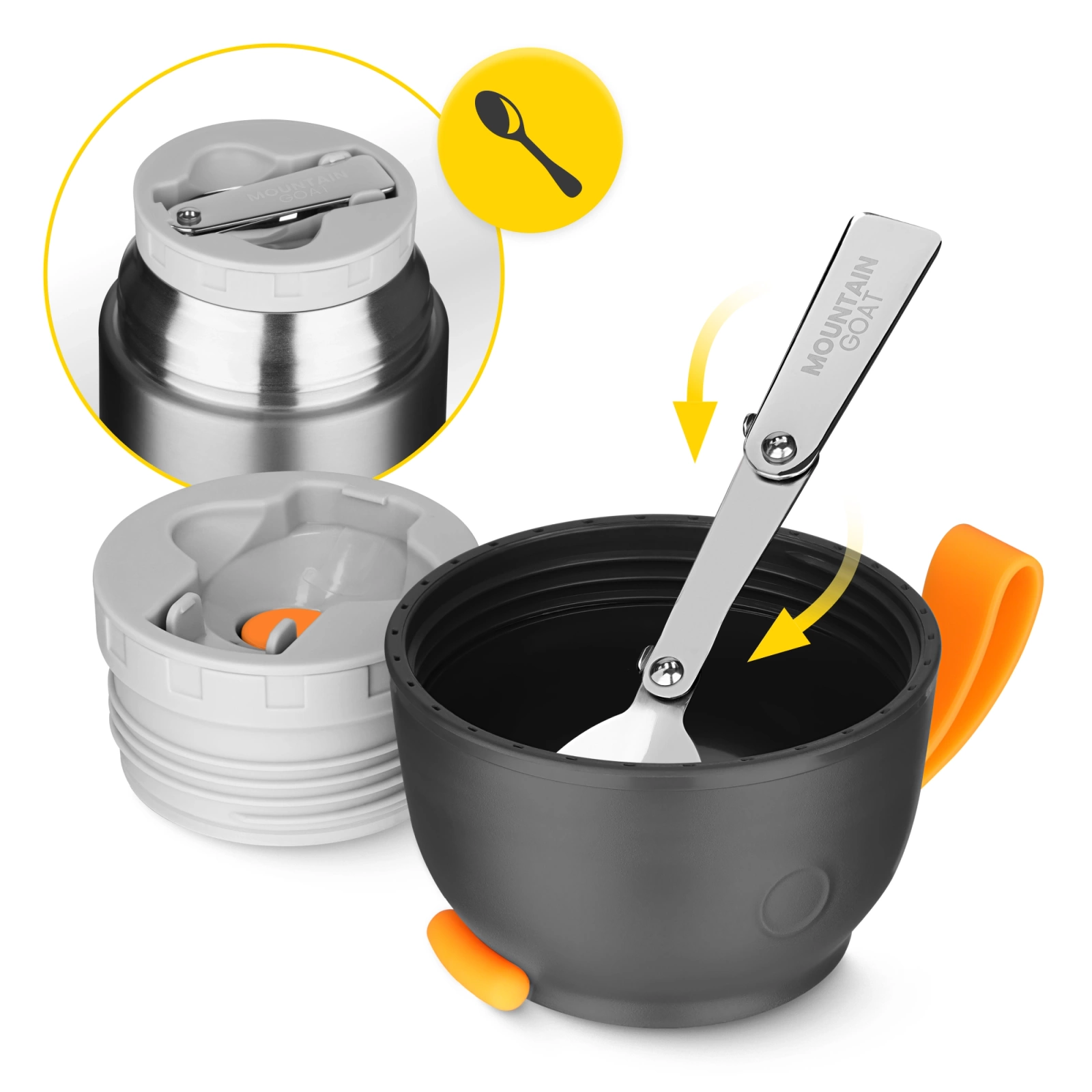 V balení naleznete skládací nerezovou lžíci, díky které si můžete jídlo vychutnat kdekoliv, a to bez nutnosti nosit další příbory. Víko termosky slouží jako praktická miska, což činí celý set ještě praktičtějším.