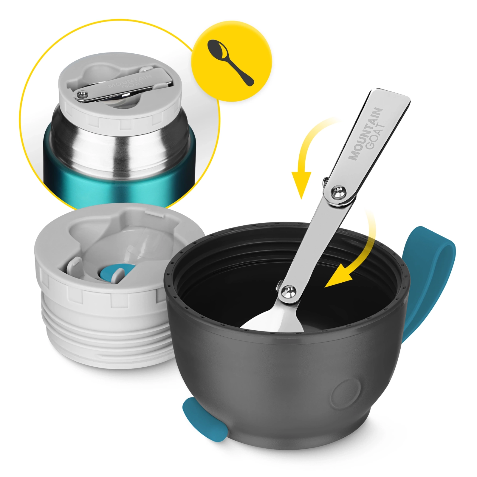 V balení naleznete skládací nerezovou lžíci, díky které si můžete jídlo vychutnat kdekoliv, a to bez nutnosti nosit další příbory. Víko termosky slouží jako praktická miska, což činí celý set ještě praktičtějším.