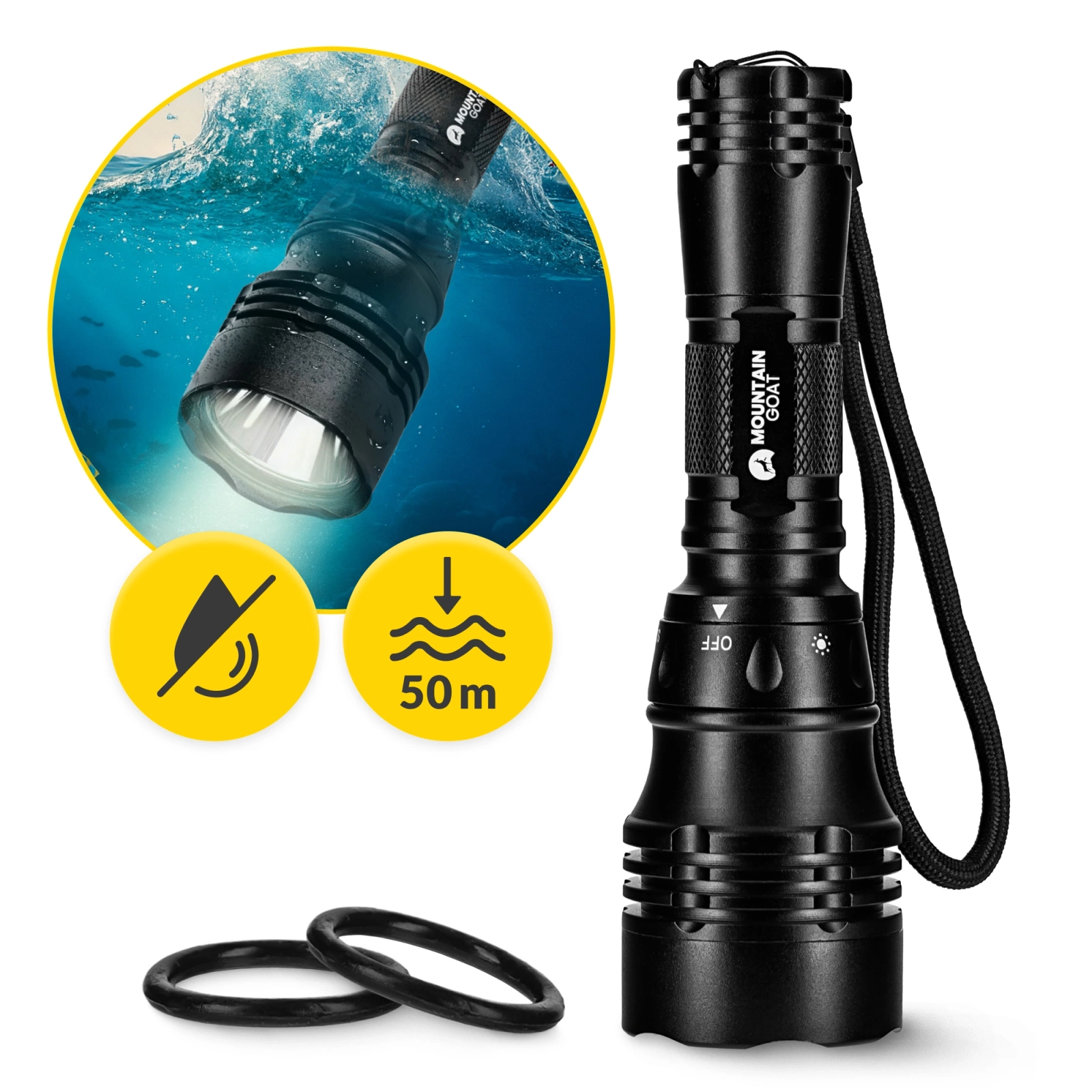 S potápěčskou svítilnou MOUNTAIN GOAT vás nepřekvapí žádná tma – ani pod vodou, ani na souši. Spolehlivý výkon a silné světlo – to vše, co potřebujete, abyste se cítili bezpečně a pohodlně za každých okolností.