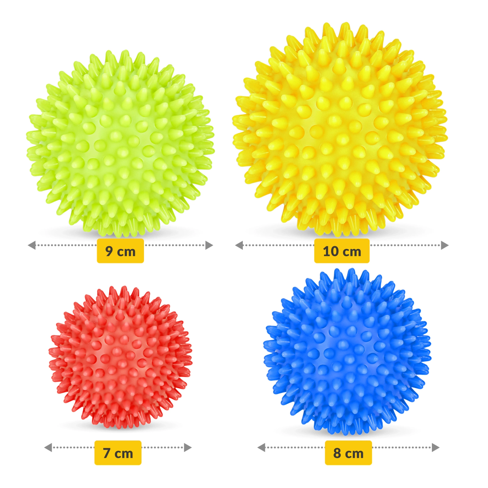 ✔️ Součástí balení: míček s ostny 10 cm, míček s ostny 9 cm, míček s ostny 8 cm, míček s ostny 7 cm