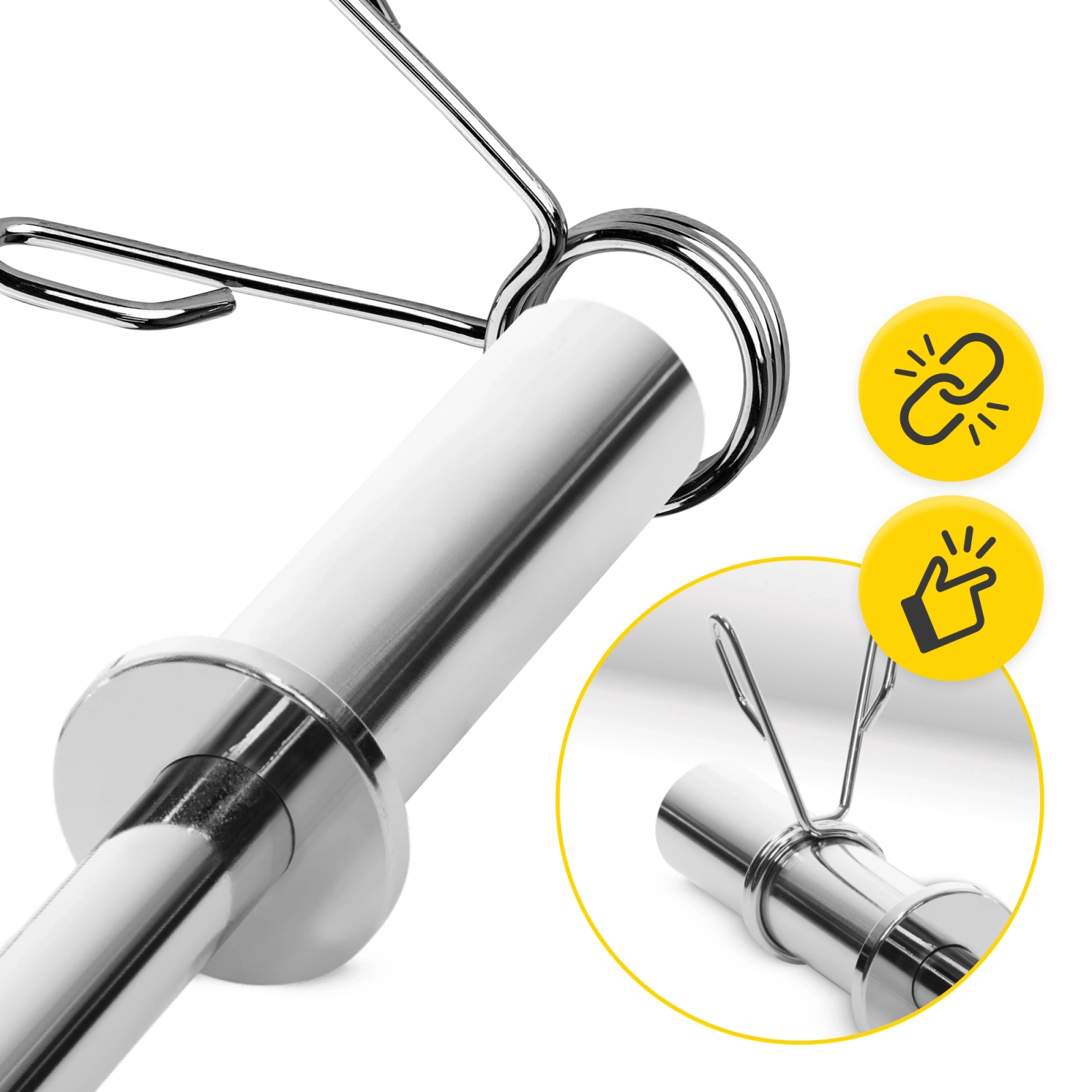 Nasazení bezpečnostních objímek na osu zabere doslova okamžik. Stačí stisknout úchyty, nasunout je na osu a pustit. Rychle a efektivně!