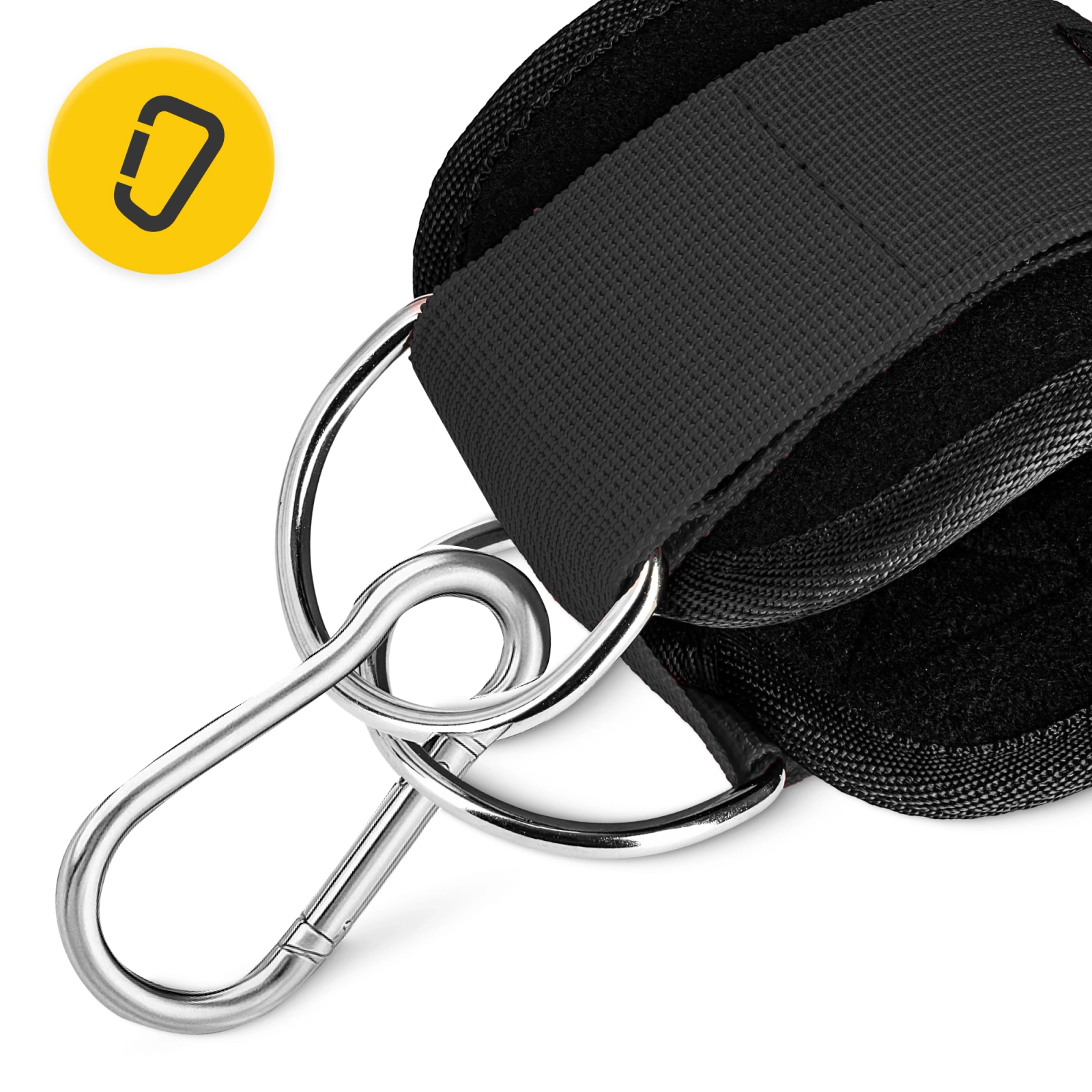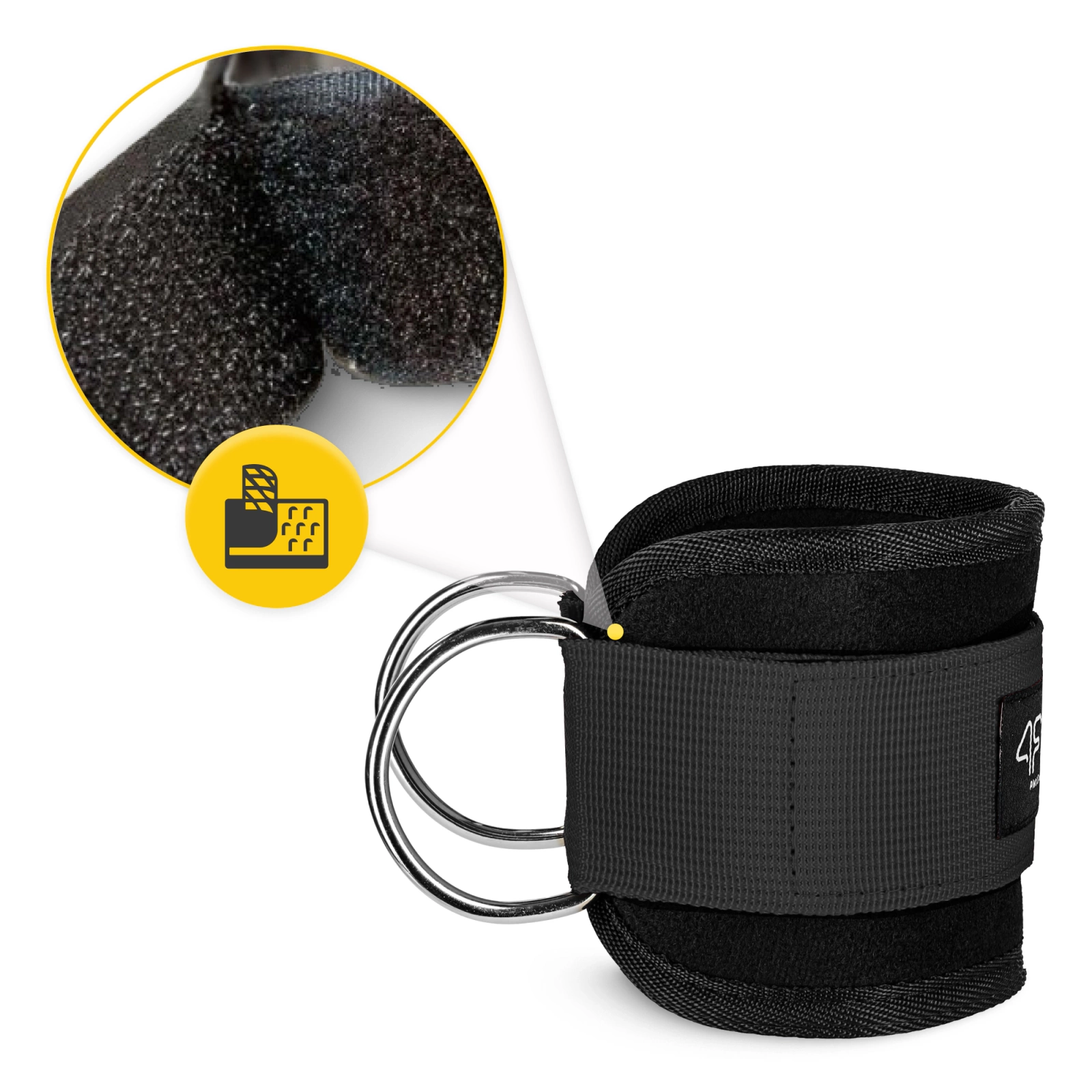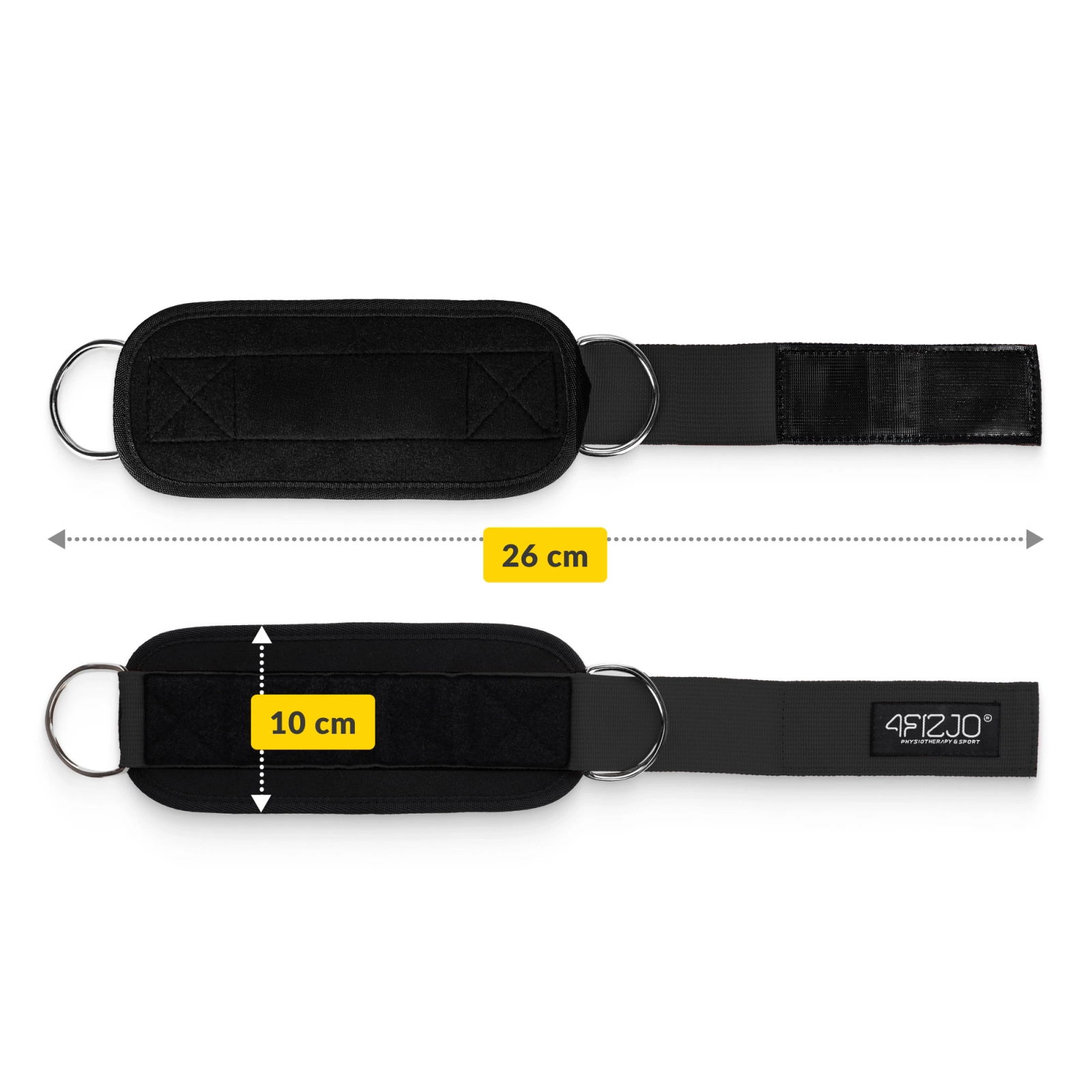 Tréninkové pásky na kotníky jsou vyrobeny z mimořádně odolného neoprenového materiálu, který zajišťuje bezpečnost při cvičení na kladce. Navíc jsou vybaveny měkkou pěnovou vrstvou, která poskytuje pohodlí v oblasti kotníku. Pro maximální stabilitu a pevnost jsou opatřeny dvojitými ocelovými kroužky pro snadné upevnění k posilovacímu stroji.