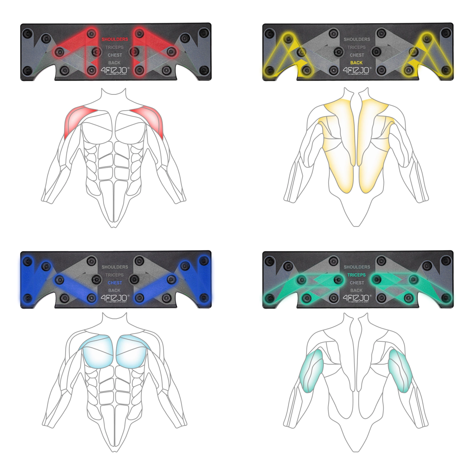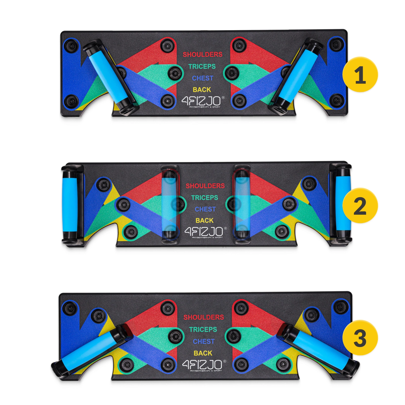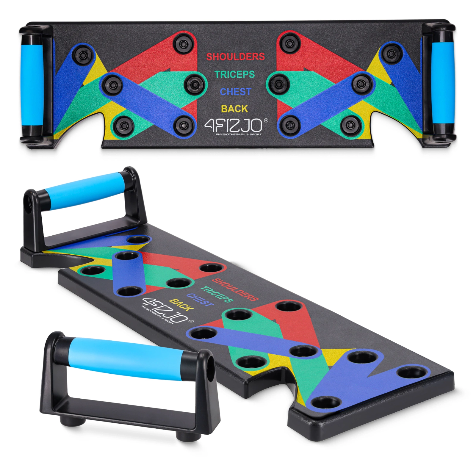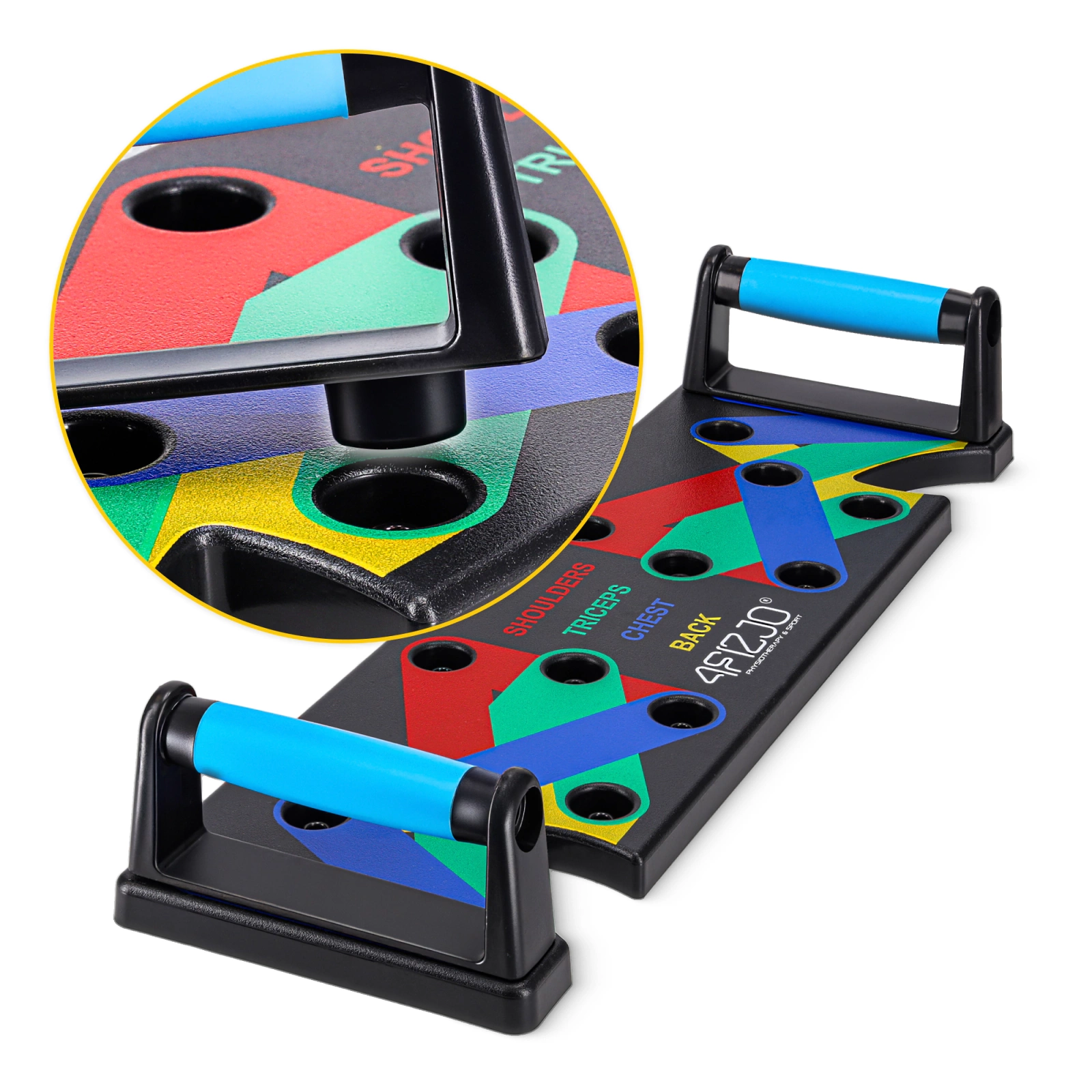 Unikátnost podpěry na kliky 4FIZJO spočívá v její 16 otvorech (8 na každé straně), které umožňují umístit úchop do různých poloh, lišících se roztečí a úhlem. Otvory jsou barevně rozděleny do 4 skupin, které odpovídají polohám pro trénink různých svalových skupin: ramena, záda, hrudník a tricepsy. Toto řešení nabízí nejen mnoho možností cvičení, ale také zajišťuje rovnoměrný rozvoj svalstva.