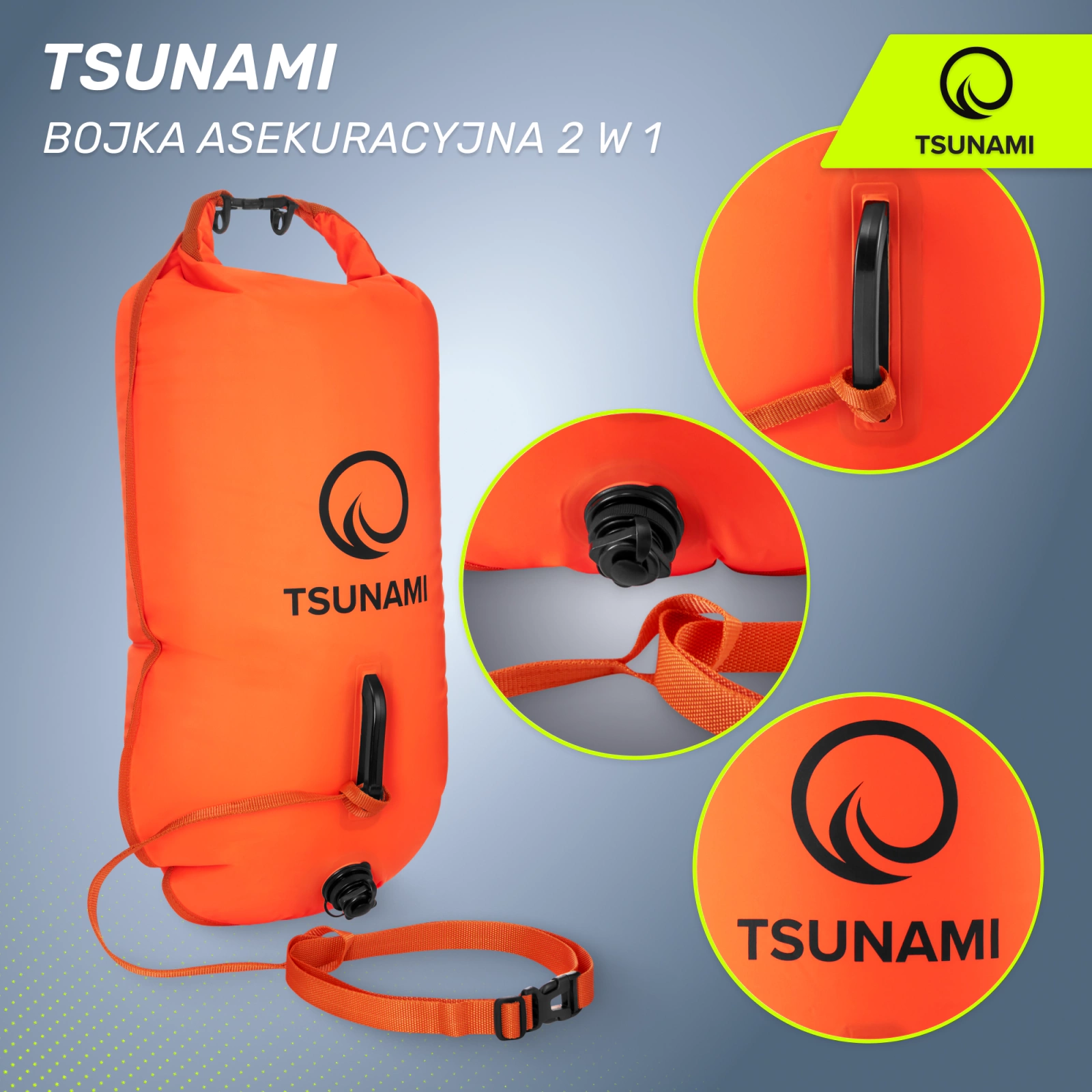 Zajistěte si bezpečnost a komfort během plaveckých tréninků či rekreačního plavání na otevřených vodách. Plavejte s nafukovací bójkou, jež rozhodně zvýší vaši viditelnost ve vodě a poskytne vám zajištění v případě křeče nebo nečekaného vyčerpání. Bezpečnost je základem plavání a bezpečnostní plavecká bójka TSUNAMI ji maximalizuje! Její používání je snadné. Je vybavená dvěma komorami na nafouknutí a její příprava k použití trvá přibližně jednu minutu.
