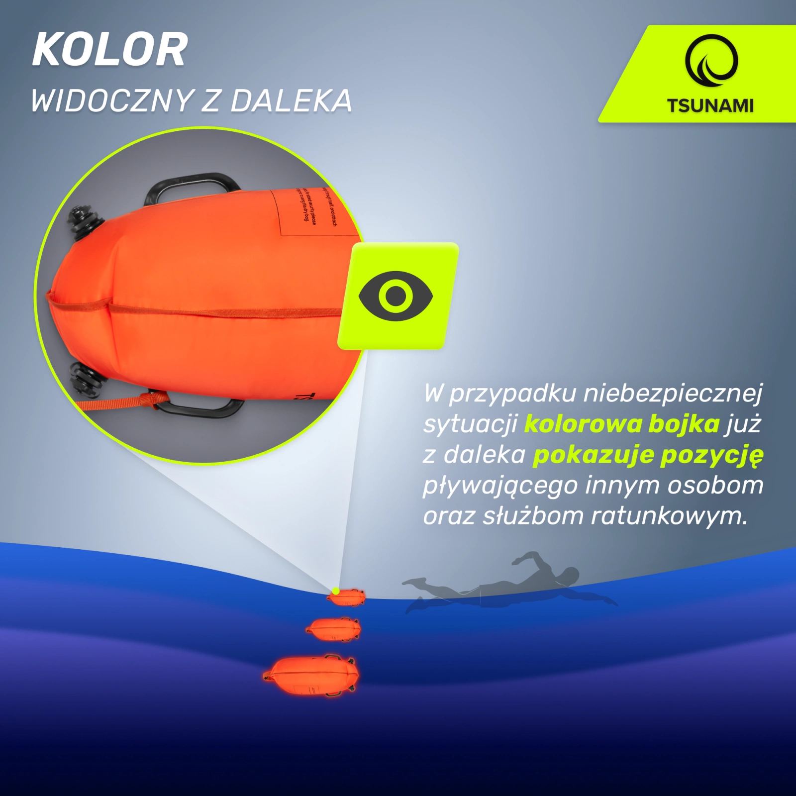 Když se zachytíte, vyčerpáte nebo vás chytne křeč, položte se na vodu na záda a opřete si hlavu o bójku. Uvolněte se a chvíli odpočívejte. Když budete potřebovat bójku, abyste se mohli vrátit na břeh, otočte se na břicho, vložte ji pod jedno rameno a druhou rukou a nohama plavte, jak jste zvyklí při běžném plavání. Díky své barvě bójka zvyšuje vaši bezpečnost na vodě – má intenzivní barvu (zajišťuje dobrou viditelnost). Dalšími výhodami jsou vysoká nosnost a suchá komora. Pečujte o svou bezpečnost ve vodě, plavejte s nafukovací bezpečnostní bójkou TSUNAMI.