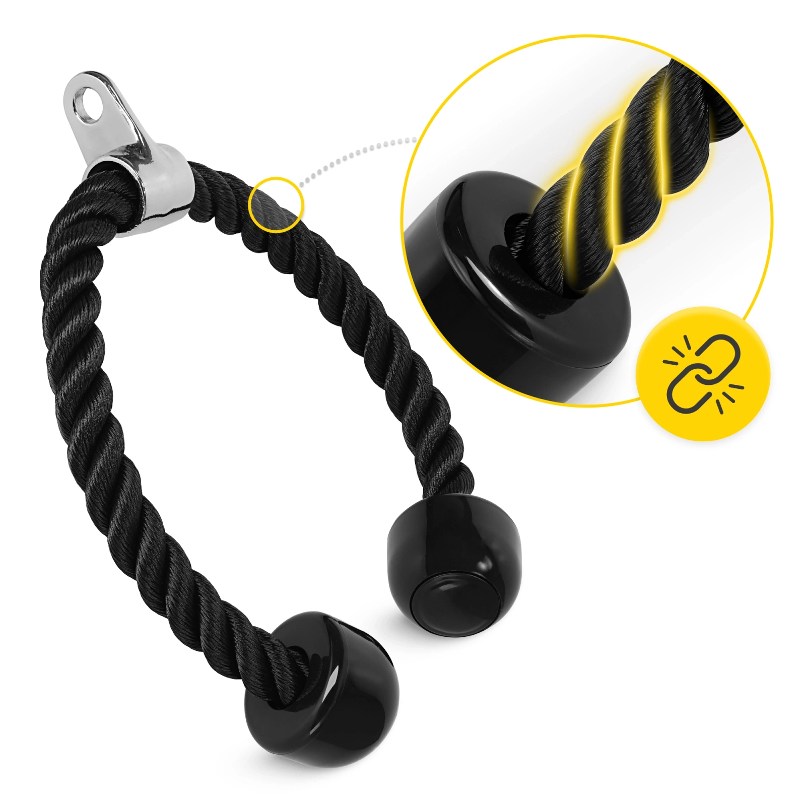 ✅ Lano má kovovou otočnou rukojeť, která usnadňuje provádění cviků nejen na tricepsy, ale i na břišní svaly.