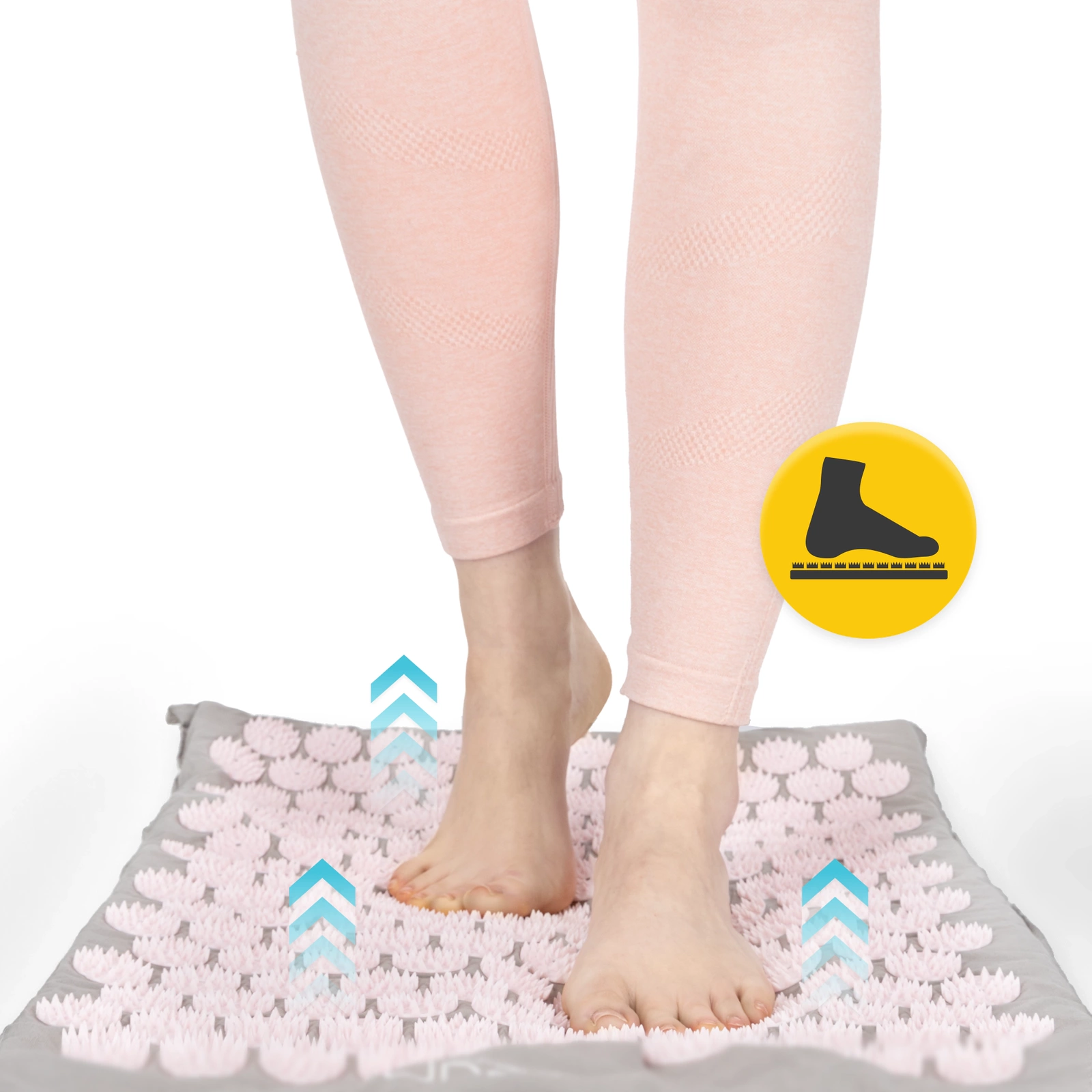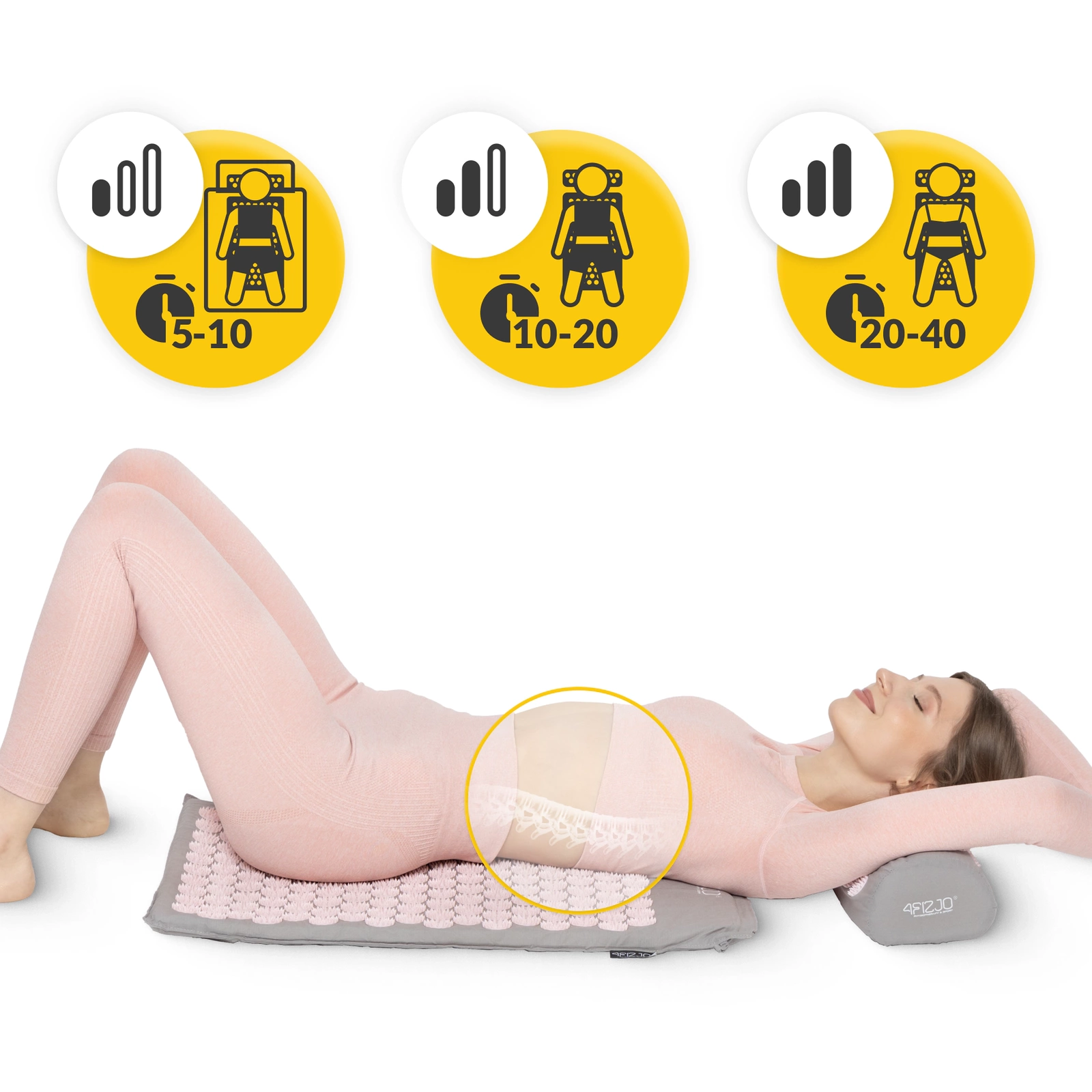 Používání akupresurní podložky je velmi jednoduché. Můžete ji používat vleže, vsedě, například při práci, nebo vstoje. Stačí ji položit na podlahu, postel nebo židli a pomalu si lehnout hlavou k polštáři. Pamatujte na toto: