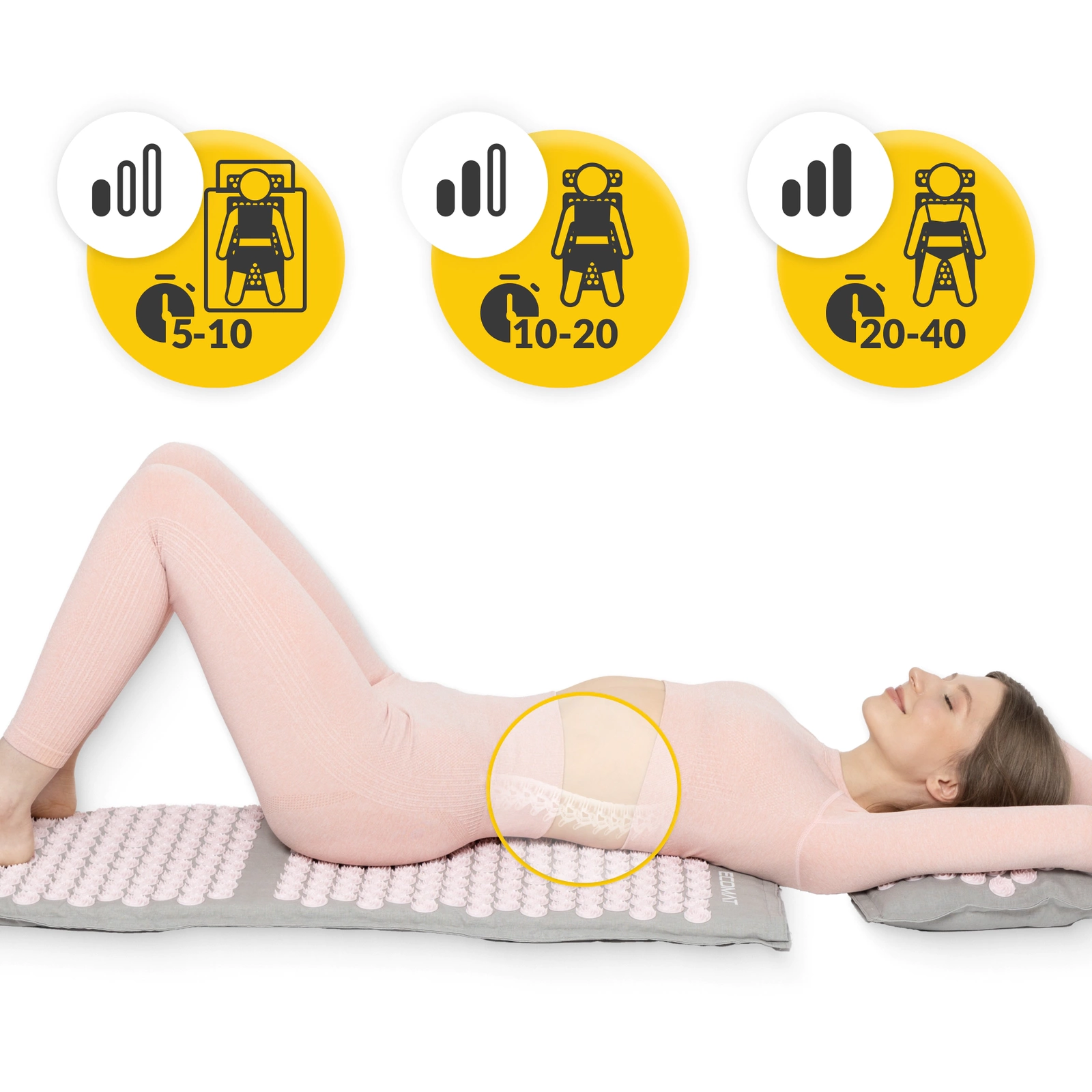Používání akupresurní podložky je velmi jednoduché. Můžete ji používat vleže, vsedě nebo vestoje. Podložku položte na podlahu, postel nebo židli a pomalu si lehněte. Mějte na paměti: