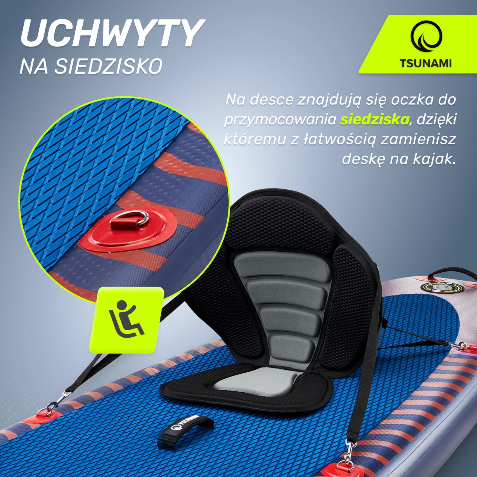 SUP prkno TSUNAMI je jedno z nejvšestrannějších sportovních zařízení. Můžete pádlovat ve stoje, na kolenou nebo vsedě. Odolný dvouvrstvý materiál zaručuje, že prkno odolá kamenům nebo jiným překážkám na řekách. A pokud vás pádlování unaví, připojte sedátko a proměňte své prkno v kajak.