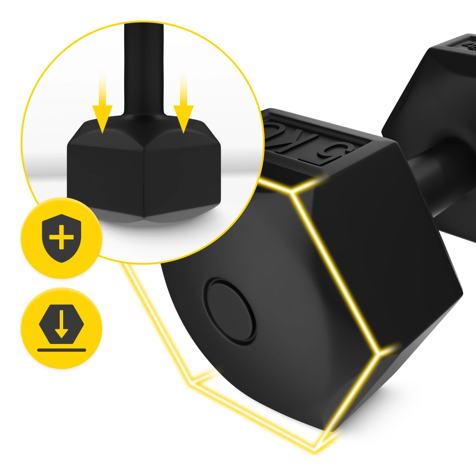 ▶️ Speciální povlak činek chrání podlahu před poškrábáním a jejich šestihranný tvar zabraňuje kutálení po podlaze, což zvyšuje bezpečnost při tréninku.