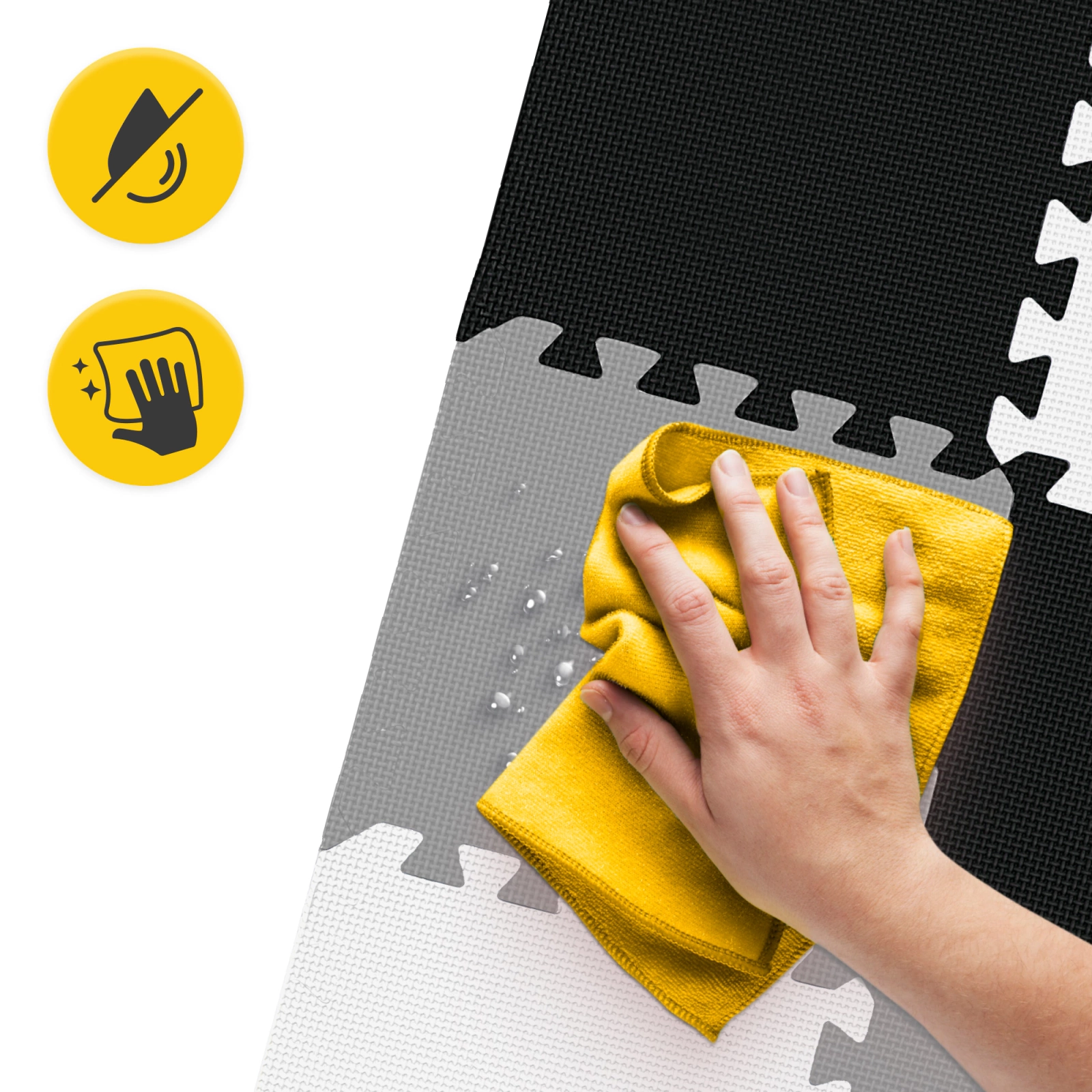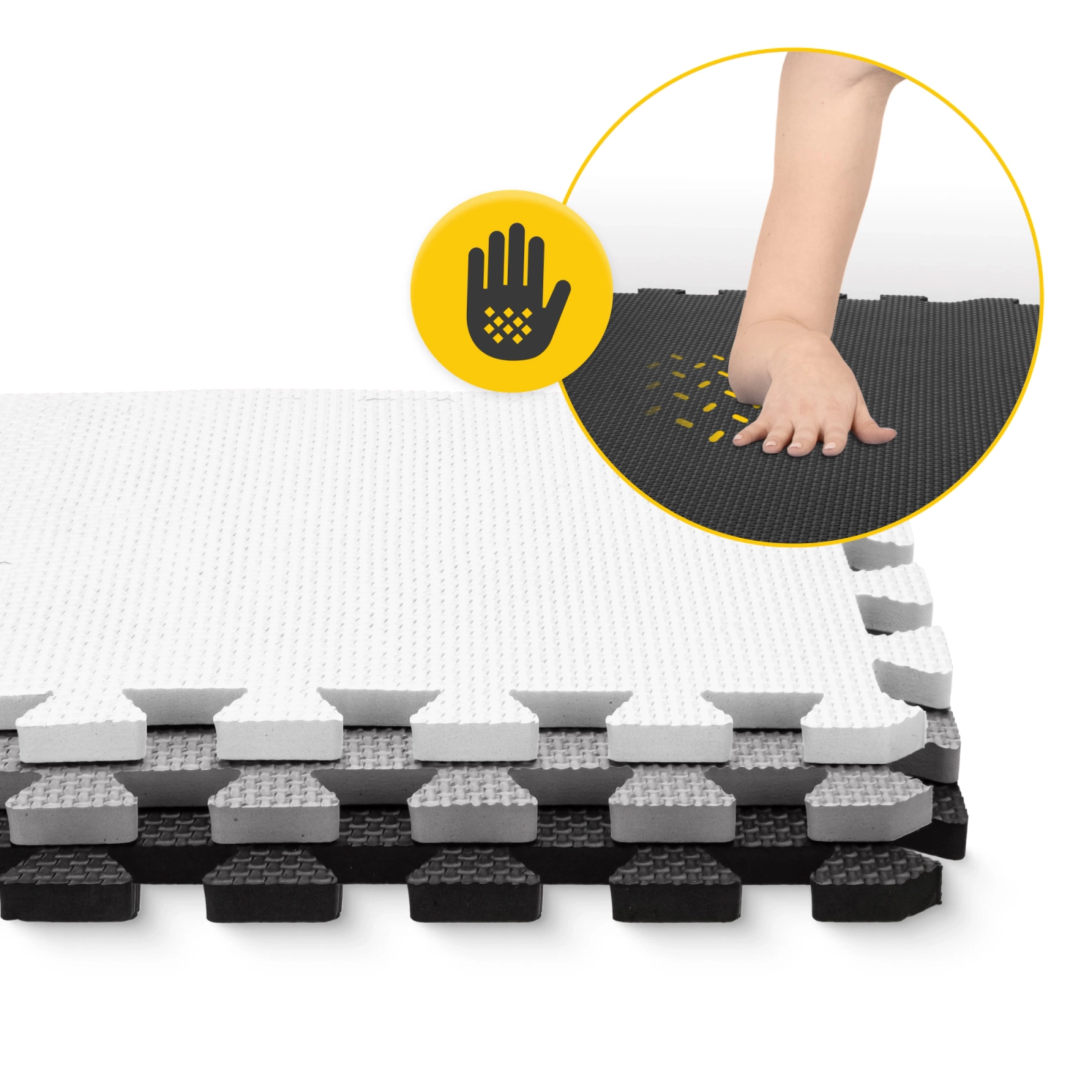 Velká pěnová hrací podložka nabízí nekonečné možnosti pro zábavu. V jednom okamžiku se může stát ideálním místem pro hraní pod širým nebem, pak se ale promění v pohodlnou podložku. Díky modulárním dílkům ve tvaru puzzle je můžete kombinovat podle libosti, a to vytvářet nové konfigurace. A pokud se hračky vašeho dítěte povalují po celém bytě, využijte pěnové puzzle pro děti k vytvoření praktické boxu na hračky. Tento kreativní způsob úklidu je skvělý nápad, jak jednoduše a zábavně naučit dítě udržet pořádek.