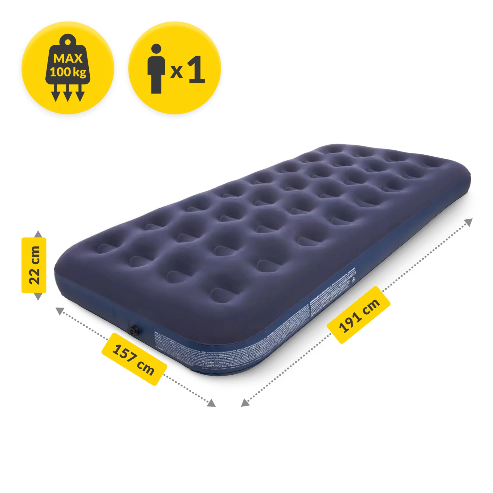 Nafukovací matrace pro jednoho je vyrobena z odolných materiálů, které spolehlivě izolují od země a chrání před mechanickým poškozením. Díky promyšlenému rozdělení na sekce nabízí matrace výjimečnou měkkost a pohodlí, které zklidní i náročné uživatele. Zaoblené okraje ještě víc zvyšují pocit pohodlí během ležení a její pružná struktura se skvěle přizpůsobí tvaru těla. Matrace je odolná vůči vlhkosti, takže je ideální volbou na každou cestu. Měkký semišový povrch zajišťuje navíc příjemný a relaxační odpočinek.