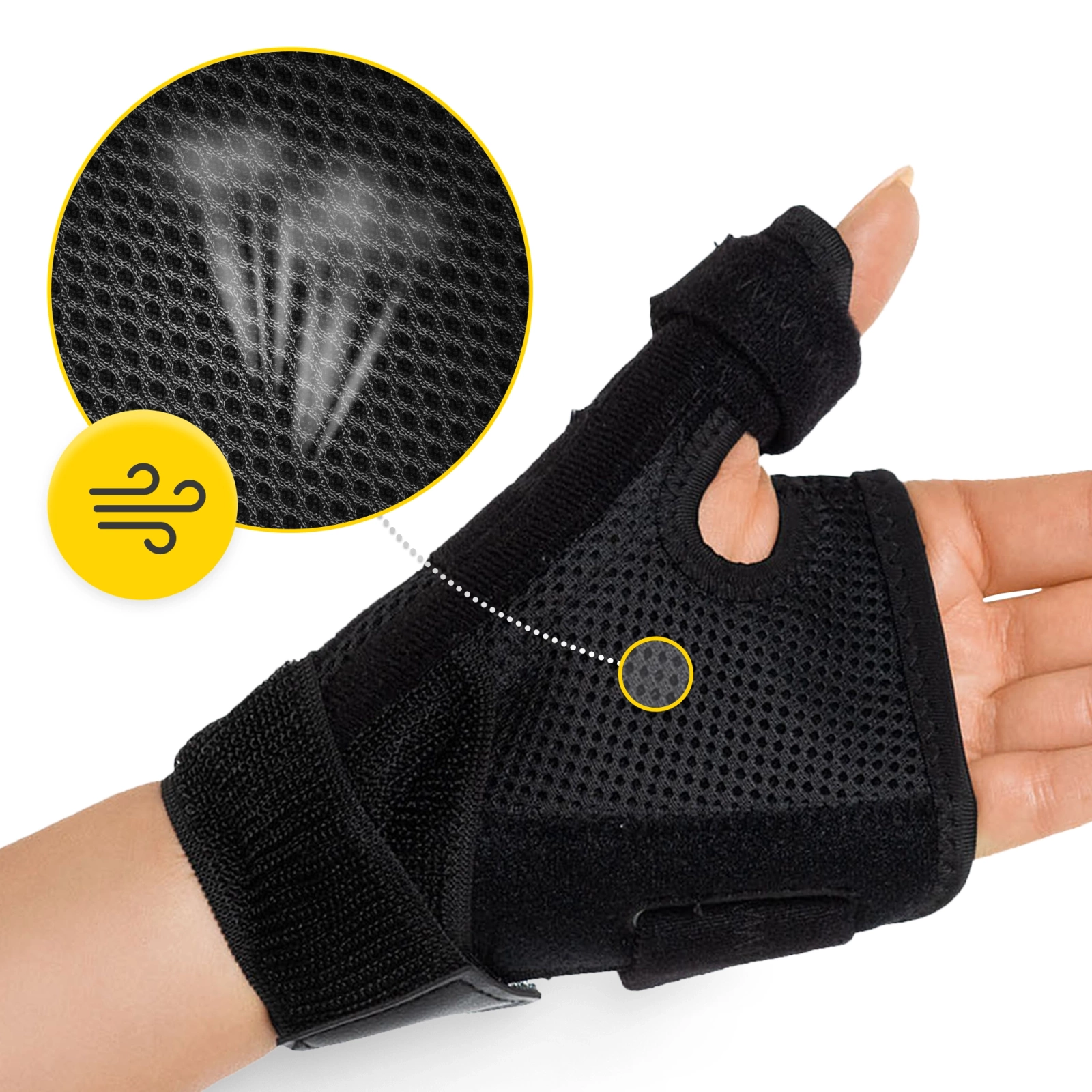 Stabilizační ortéza na zápěstí a palec byla navržena s ohledem na maximální pohodlí a účinnost. Materiál Airmesh zaručuje: