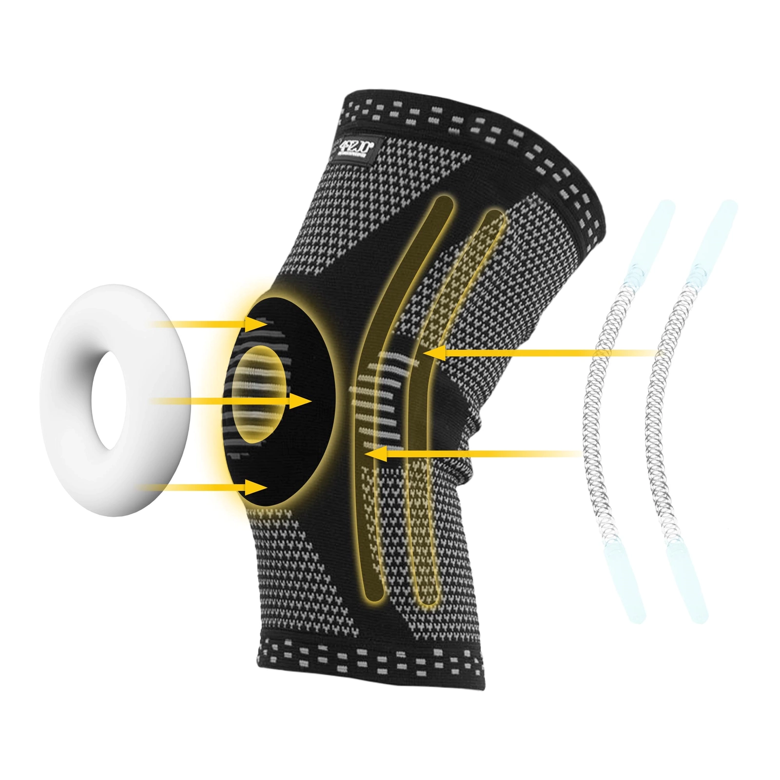 Kolenní ortéza má vestavěný gelový kroužek, jenž plní důležitou roli ve stabilizaci čéšky a minimalizuje riziko jejího poškození. Elastický kroužek na čéšku se přizpůsobuje výstupkům kolen. Díky tomu je nošení této ortopedické pomůcky velmi pohodlné. Elastické vložky chrání koleno před následky náhlých rotací kloubu. Anatomicky tvar vložek umožňuje volné ohnutí kolena bez tlaku na boční vazy. V důsledku toho ortéza kolenního kloubu eliminuje pocit nepohodlí. Silikonová úprava na vnitřní straně stabilizátoru účinně zabraňuje jeho samovolnému sklouznutí dolů.