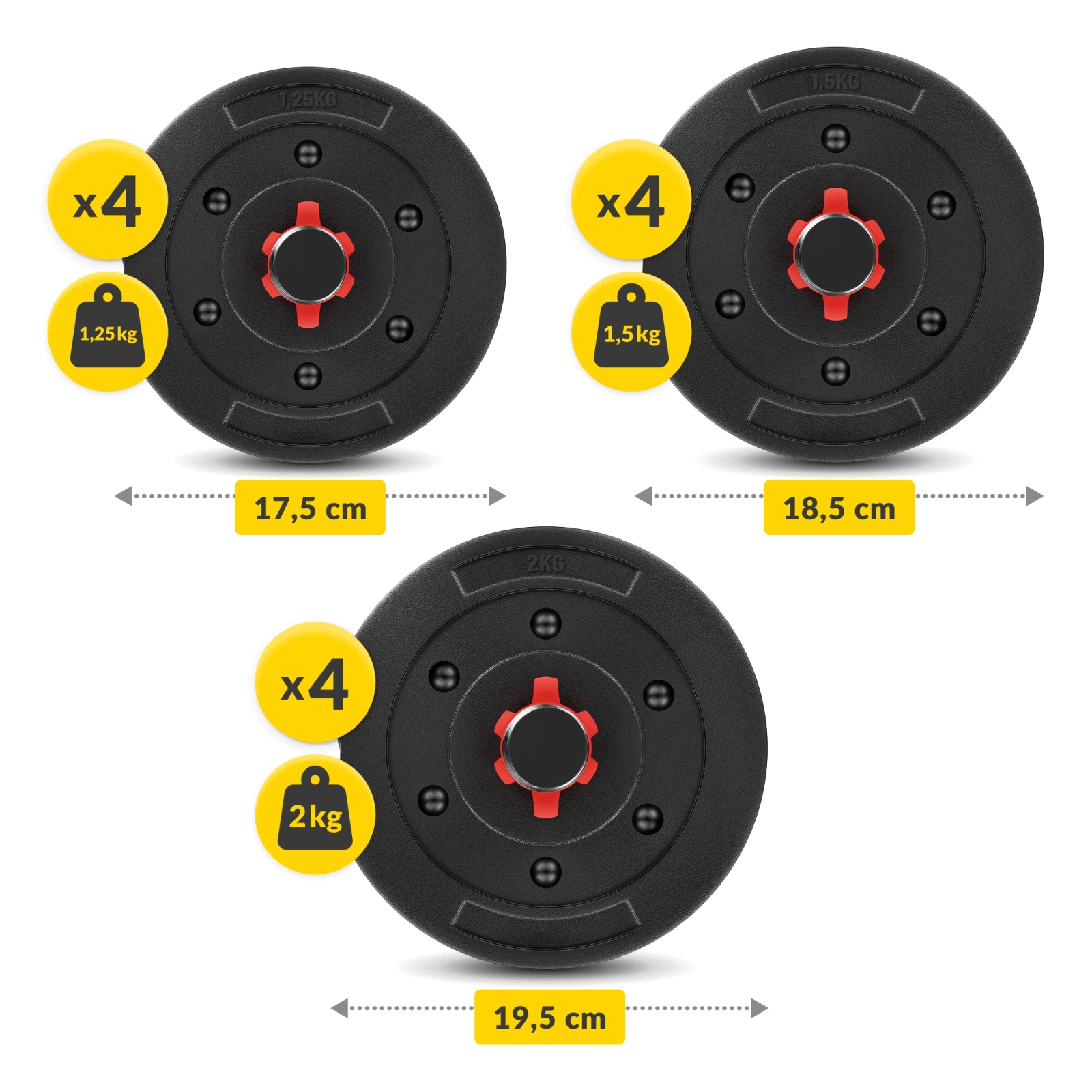 ▶️ Sada 12 talířů různých hmotností umožňuje snadno přizpůsobit zátěž podle konkrétního cviku a úrovně zdatnosti.