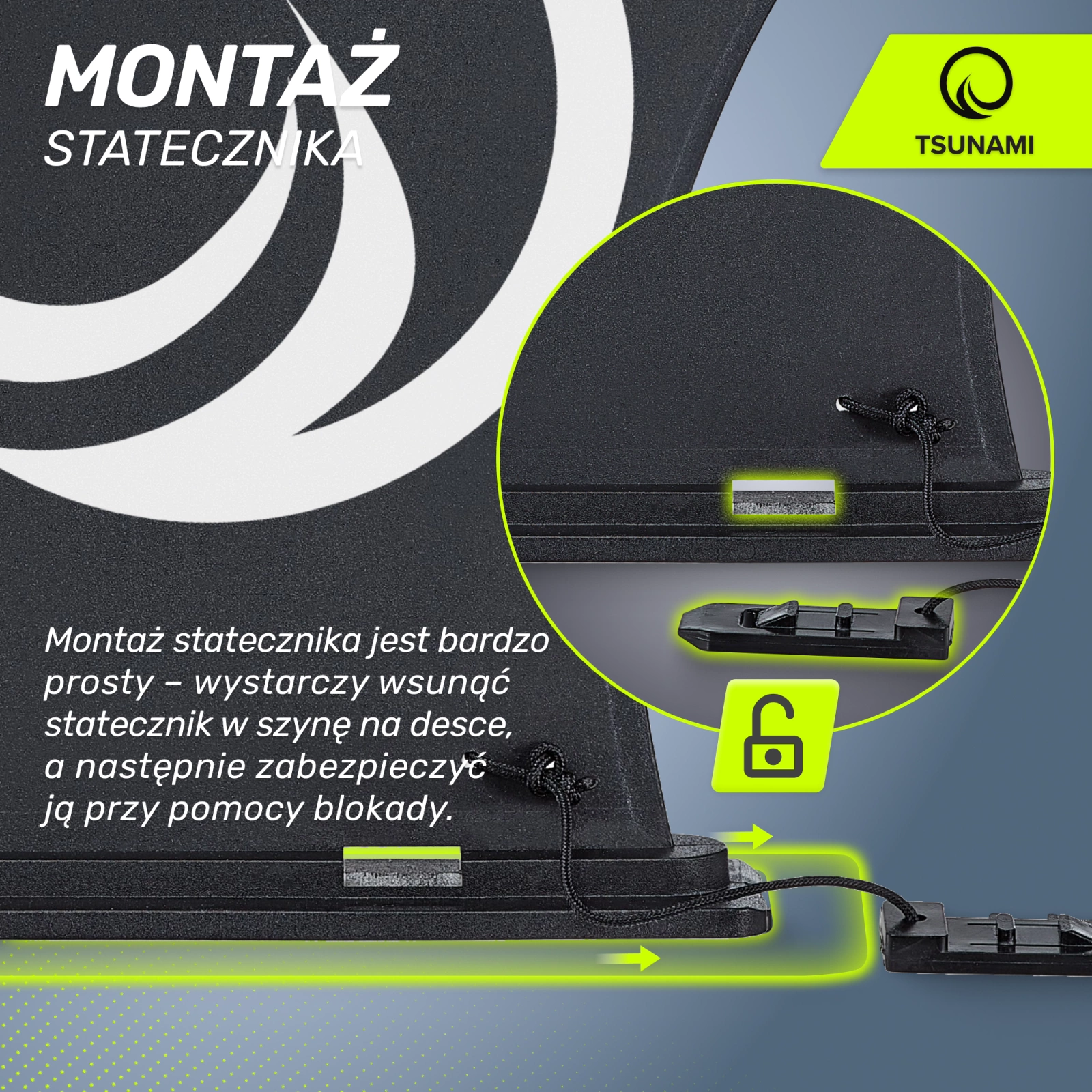Ploutev to klíčová součástí každého paddleboardu SUP – zajišťuje totiž jeho stabilitu a přesné manévrování a chování na vodě. Bez ploutve ztrácí prkno ovladatelnost, stává se citlivějším na vlny a chaotické pohyby pádla. Univerzální ploutev TSUNAMI pro paddleboard SUP je ideální řešení pro každého nadšence paddleboardingu. Je vhodná pro většinu prken vybavených středovou ploutví typu SLIDE-IN, přičemž její instalace je mimořádně snadná – stačí ploutev zasunout do lišty na prkně a zajistit zajišťovacím mechanismem.